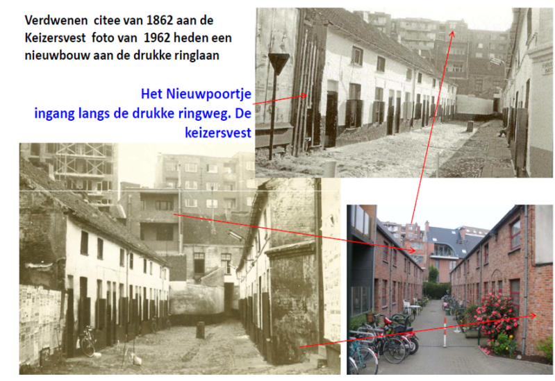 In 1837 gebouwd als twee rijen rug-aan-rug-huizen, merkbaar aan de schouwindeling. Onder druk van de stad Gent, telkens een achter- en voorhuis samengevoegd. Vandaar de achterdoorgang achter de huizen (thans geprivatiseerd tot koertjes) en een gevelindeling aan de achterzijde overeenstemmend met de voorzijde.