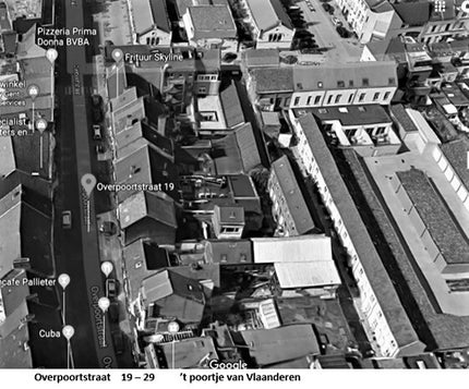 De zeven huisjes, alle met een verdieping boden onderdak aan 20 mensen. We citeren het rapport verder: ‘De huizen zijn in goeden staat en wel onderhouden. De inwoners zijn zoals het moet, uitgezonderd deze van nr. 41. Daar is ’t ongelooflijk vuil en de stank komt van onder de deur. Daarin wonen twee lieden welke gansche dagen de vuilnisbakken gaan uitzoeken. De buren doen een algemeen verzoek om het huis te doen ontsmetten’. Anno 2014 is er links van het huis met de kapel en nog een huis ernaast een ander nu afgesloten beluikje herkenbaar. De bewoners van deze cité iets meer naar het Sint-Pietersplein toe, stelden het beter ... alhoewel: er was slechts één gemak (met gebroken geurafsnijder) en één pissijn, een pomp, maar geen stadswater. De zes huisjes, rug aan rug met die van het vorige beluik, allen met een verdieping, waren in goede toestand en goed onderhouden. De 16 bewoners waren ‘voorbeeldig’ (zo staat het er letterlijk). Maar ook hier een probleem: de riool voor huis nr. 29 ‘die zoveel ongemakken aan de bewoners van het huis levert: als ze verstopt geraakt bereikt het vuil water de deurzul’.