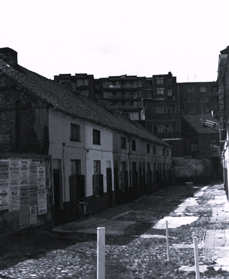 In 1837 gebouwd als twee rijen rug-aan-rug-huizen, merkbaar aan de schouwindeling. Onder druk van de stad Gent, telkens een achter- en voorhuis samengevoegd. Vandaar de achterdoorgang achter de huizen (thans geprivatiseerd tot koertjes) en een gevelindeling aan de achterzijde overeenstemmend met de voorzijde.