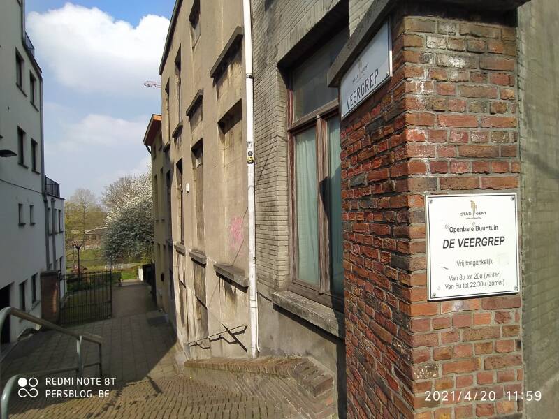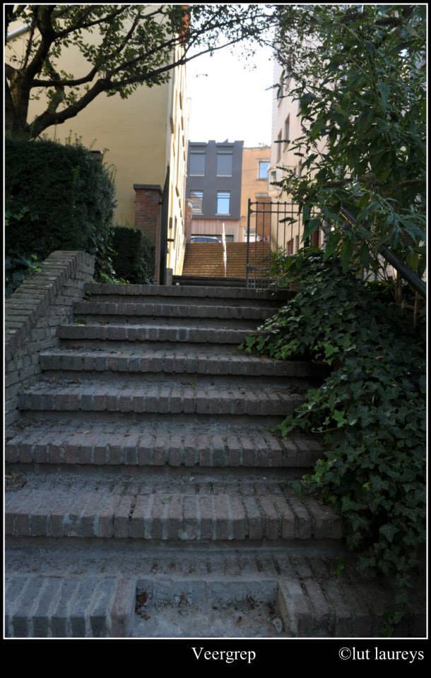 Vanouds bekende zijsteeg van de Kortrijksepoortstraat met sterk dalend straatniveau naar de Leie toe. Straatje in trapvorm met centrale ijzeren leuning. Tijdens eerste kwart 19de eeuw reeds aan weerszijden met arbeiderswoningen bebouwd. Op het braakliggende terrein rechts achteraan met heden enkele muurresten en verder een spontane vegetatie bevond zich (een volledig ingestort) driezijdig bebouwd pleinbeluik met open zijde naar de Leie gericht.