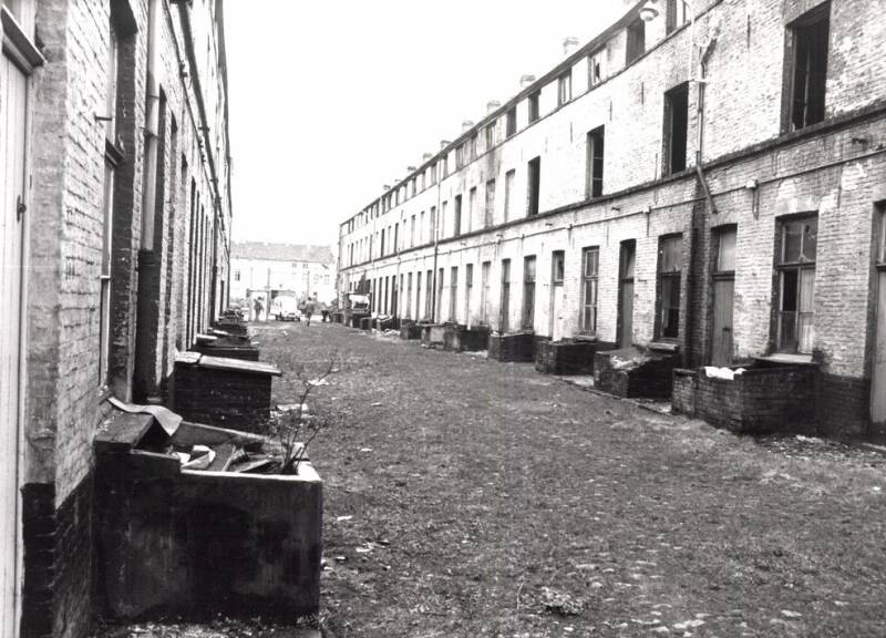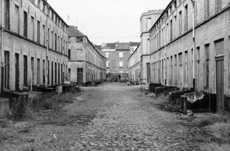 De beide links en rechts (op de straat staande) brede steegbeluiken kunnen gezien worden als een voortzetting van het in 1859 gebouwde beluik in het Berouw (nummer 204 tot 248) (thans gesloopt). Het zuidelijk beluik dateerde van 1870 evenals de woningen nummer 134 tot 142. Het tweede beluik werd in drie bouwfasen opgetrokken: 1871 (nummer 56 tot 66 en 116 tot 132), 1872 (nummer 68 tot 82) en 1873 (nummer 84 tot 114); bouwheer was "bouwkundige" Ferd. De Drijver. Opmerkelijk in beide beluiken is het gebruik van het rug-aan-rug-type voor de oostelijke rij woningen doch volgens verschillend grondschema voor beide beluiken. Het beluik nummer 56-136 bezit een gekasseide steeg met achteraan een batterij toiletten. Aan weerszijden bebouwd met steegbeluikhuizen van twee en een halve bouwlaag onder zadeldak (pannen); getoogde openingen met natuurstenen dorpel op begane grond, en doorlopende bakstenen lijst als dorpel op de verdieping. Kolenbakken onder de vensters; verankerde gekalkte gevels op gepikte plint. De huizen nummer 104 tot 136, aan rechterzijde, van twee traveeën volgens repeterend schema; één kamer per bouwlaag, en blinde achtergevel. De huizen nummer 56-102 zijn rug-aan-rug-huizen, waarbij naast een klein woonhuis (twee traveeën uitziend op steeg) zich een deur met smalle doorgang naar achterhuis bevindt. Linkergevel eveneens van twee traveeën uitziend op een klein privé-koertje met berghok. De huizen aan deze zijde der steeg bezitten slechts één kamer per bouwlaag.