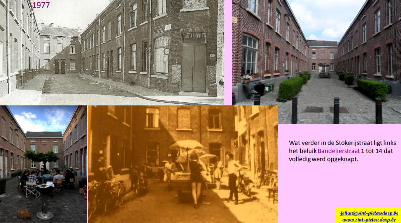 De overzijde van de Stokerijstraat en het verder verloop wordt voornamelijk gekenmerkt door drie in dezelfde stijl ontworpen steegbeluiken met toegang op straatbreedte met name de Cargadoorstraat en de Vizierstraat rechts en de Bandelierstraat bij het einde van de straat links, daterend van 1882 en 1883. Ze omvatten sobere bakstenen hoekhuizen met afgesnuite travee in de Stokerijstraat (nummers 6-8, 10-16, 18, 53-55, 57-59). Drie bouwlagen hoog, onder afgewolfd dak (pannen) geritmeerd door getoogde vensters met arduinen lekdrempels en afgelijnd door een baksteenfries onder de kroonlijst op klosjes. Gemarkeerde deuren onder gebogen druiplijst bij nummers 6, 12 en 14. De beluiken vormen telkens een doodlopend geplaveid straatje, doorlopend genummerd van 1 tot 12, afgesloten door twee huisjes. Gelijkaardige bakstenen arbeidershuisjes met twee en een halve bouwlaag en twee traveeën geritmeerd door blinde bakstenen risalieten boven de deur. Identieke omlopende baksteenfries onder de kroonlijst.