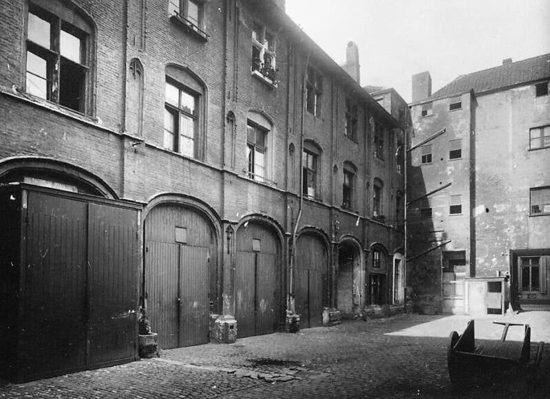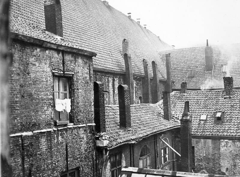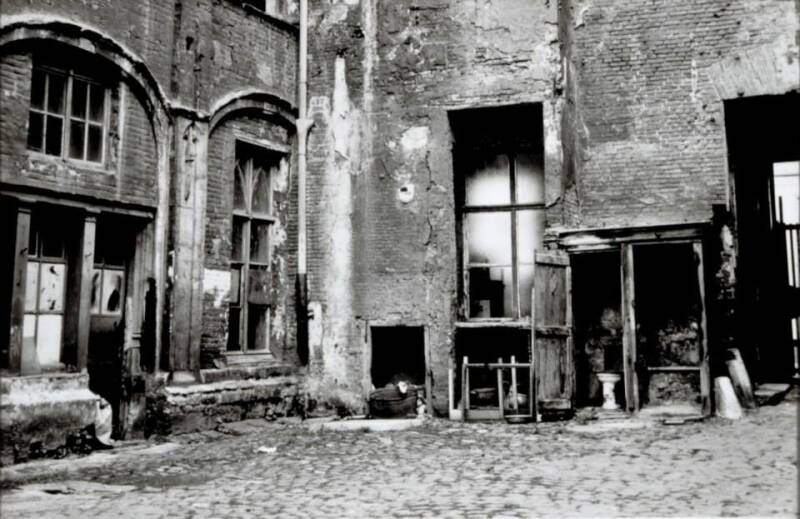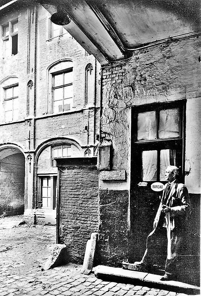 Het Pand staat gekend in de bevolkingsregisters als zijnde de huizen dragend de onpare nummers van 1 tot en met 15 (afb. 1 en 2). Het merkwaardigst gedeelte, op ons standpunt is nr. 7. Dit heeft een totale oppervlakte van circa 2.000 m2 en is bewoond door 206 personen waarvan 35 kinderen onder de 20 jaar en 25 wettelijk gehuwde paren. Tussen die oppervlakten ligt een koer van circa 200 m², garages en bergplaatsen. De meeste bewoners zijn alleenstaande mannen of vrouwen. Ieder ‘appartement’ bestaat uit een of meer plaatsen. Deze worden verhuurd, naargelang, van 70 Fr. tot 150 Fr. per maand (70 Fr. voor zij die er woonden vóór 1940). Eén persoon betaalt er nochtans maandelijks 450 Fr. voor een plaats van 4 op 7 meter en een kamertje van 3 op 3 m. Het gezin bestaat er uit vader, moeder en 4 kinderen, allen minder dan 8 jaar. Een andere familie met 4 kinders betrekt er een plaats van 4 op 5,5 m. Modern comfort! Wat niet in huis kan ondergebracht worden, wordt in de gang gezet. De bevolking van ‘t Pand is weinig arbeidzaam: 17 personen hebben een beoep (metser, chauffeur, betonarbeider, enz…) doch zijn meestal niet gespecialiseerd. Al de andere personen (buiten kinderen) zijn ouderdomsgepensioneerden of leven van de Openbare Onderstand. Twee huishoudens hebben als enig inkomen wat ze gaan rapen in vuilbakken of op de ‘storten’. Vele zijn beroeps doppers. De kinderen worden in dit milieu op verschillende manieren verzorgd. Som - migen hebben oppassende ouders en, buiten de gebrekkige huisvesting, genieten ze een normaal kinderleven (de zedelijke gevaren op zij gelaten); de andere kinderen, en ’t is de grootste hoop, zijn aan hun lot overgelaten. De oudsten zorgen voor de jongste en ieder trekt wat zijn plan voor eten en netheid. De school wordt regelmatig gevolgd, meer als ontlasting van de ouders, die ook tijdens de verloven de kinderen voor ‘verse’ lucht naar de kosteloze kolonies sturen. Bij ziekte van enig belang is er de ambtshalve overbrenging naar het stedelijk gasthuis. De huisvesting is zoals ik reeds zegde zeer gebrekkig. In vele gangen moet men, om zeker te zijn zijn nek niet te breken, licht gebruiken. Bijna overal regent het door. Het water wordt getapt aan een kraantje voor een lange gang, en de WC’s zijn meer onnoemelijke vuil(h)aarden dan iets anders. Het is dan ook gewoonlijk de emmer die gebruikt wordt en die, volgens de hygiënische principes van de bezitter eens of meer per dag, of als het niet anders meer kan, gereinigd wordt. Gebroken ruiten worden gewoonlijk door planken of een stuk balatum vervangen of bijgewerkt. Sinds vele jaren zijn de gangen, enz niet meer gewit geweest en de gezamenlijke vuilnisbak wordt niet steeds gebruikt, want overal wordt wat vuil gesmeten, geveegd of achtergelaten.