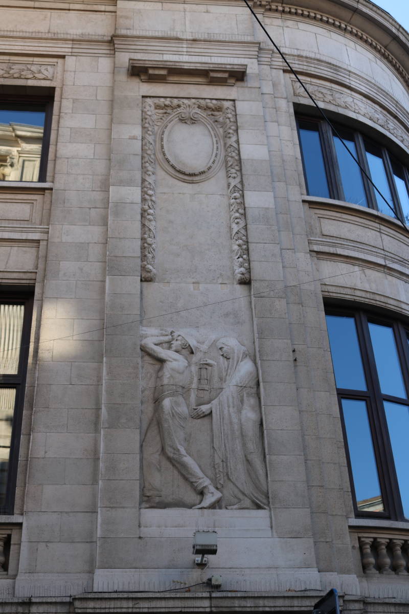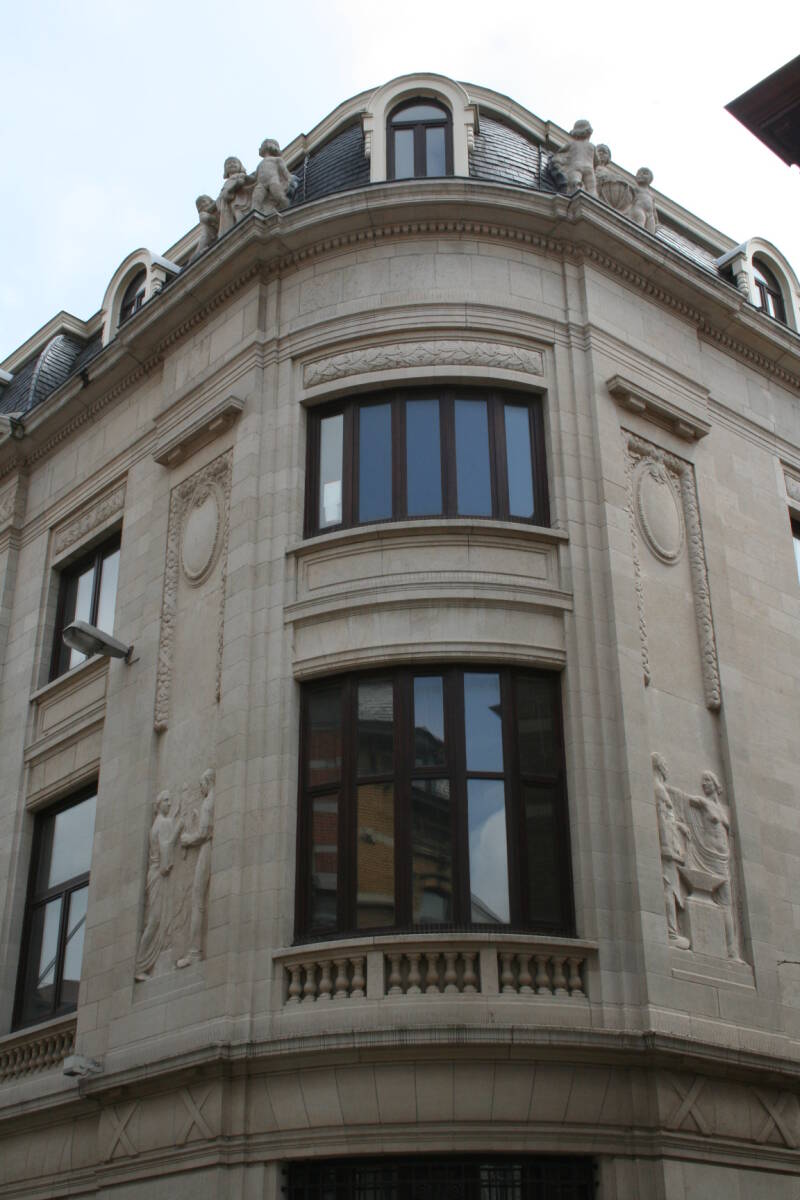 Brede uitspringende hoekpenanten zijn verrijkt met bouwsculptuur ontworpen door beeldhouwer Geo Verbanck (1881-1961). Vijf bas-reliëfs stellen het werk in de landbouw, de mijnbouw, de textielindustrie, de metaalnijverheid en de bouwnijverheid voor. De penanten worden bekroond door beeldengroepen van putti. Deze symboliseren de industrie, de handel, de scheepvaart, de wetenschappen en de kunst.
