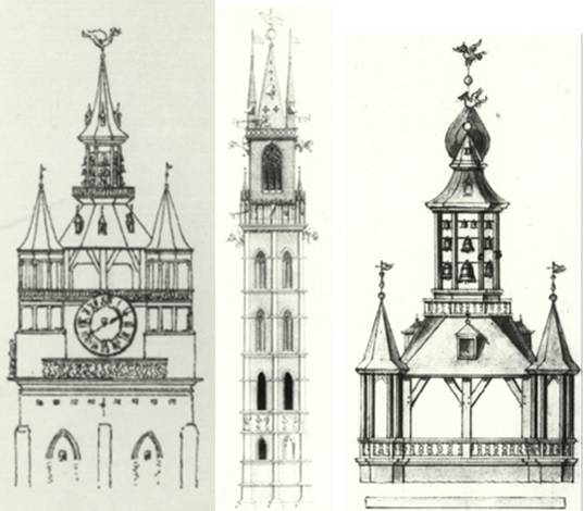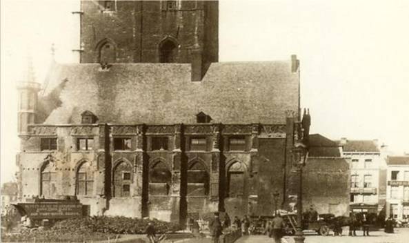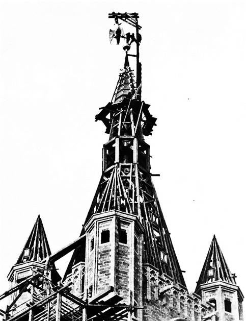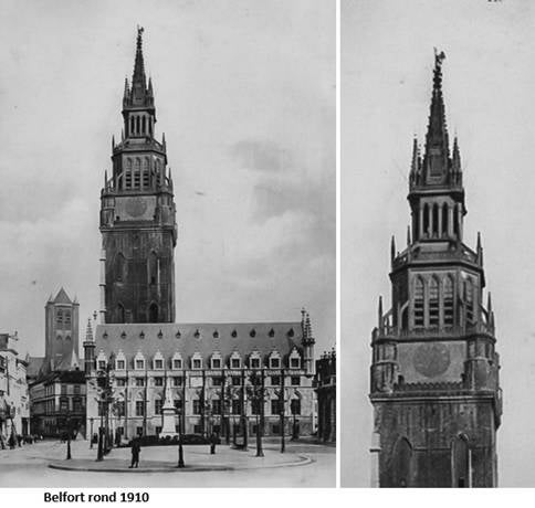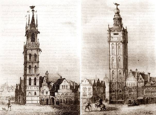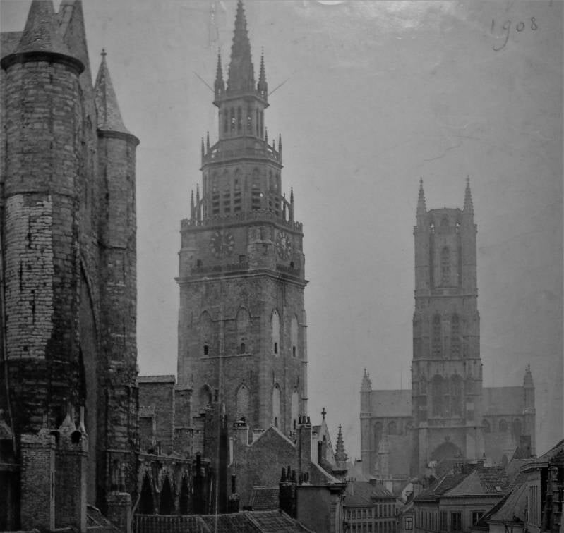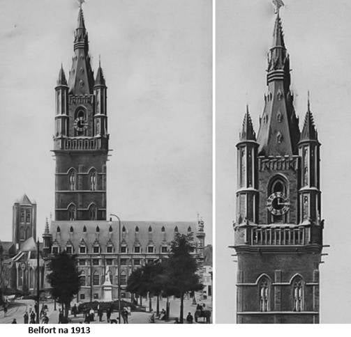 Zo verkreeg de campanile in 1771 een punttorentje naar een ontwerp van architect Louis 't Kindt (het barokke ontwerp van Lieven Cruyl van 1684 werd nooit uitgevoerd); in 1851, na twaalf jaar lang zonder klokkentoren gesierd te zijn, verscheen de neogotische spits van gietijzer uitgevoerd naar ontwerp van architect Louis Roelandt. Deze ijzeren bekapping werd bij aanvang van de 20ste eeuw afgebroken en tussen 1911-1913 vervangen door de huidige stenen torenspits. De werken werden uitgevoerd onder leiding van Valentin Vaerwijck wiens plannen sterk geïnspireerd waren op het oorspronkelijk ontwerp uit de 14de eeuw.