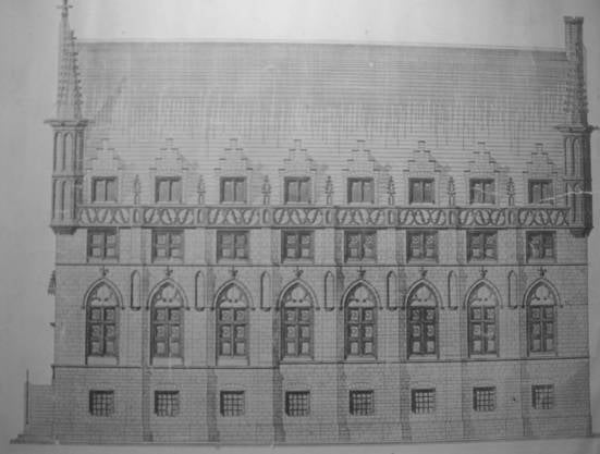Toen de Gentse lakennijverheid ging slabakken, bleek het oorspronkelijke ontwerp immers te groot en te duur. Daarom werd beslist de zevende travee "tijdelijk" af te sluiten met een houten wand. Toen het ernaar uitzag dat het bij zeven traveeën zou blijven, werd de houten wand door een gemetselde muur vervangen.