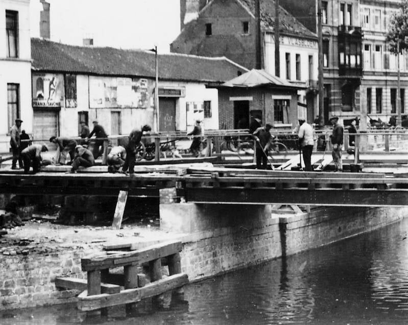 Toen werden de nood-wipbruggen, welke tijdens de duur van de laatste oorlog dienst hadden gedaan aan de Visserij, herplaatst aan de Nieuwe Wandeling.