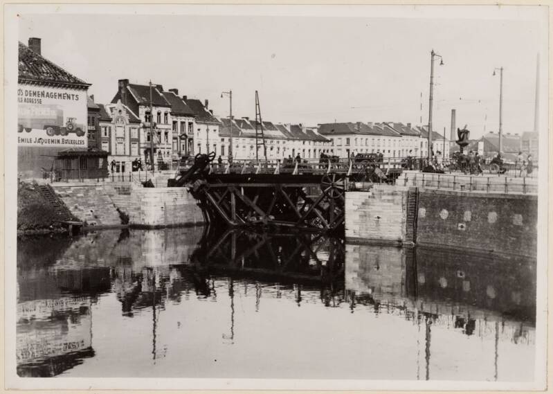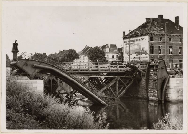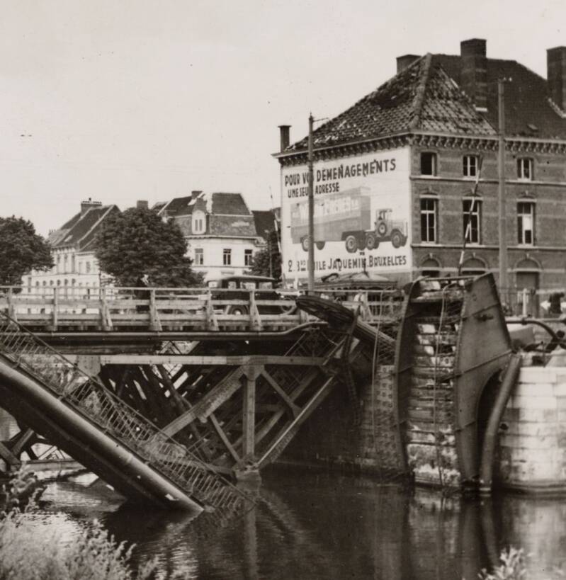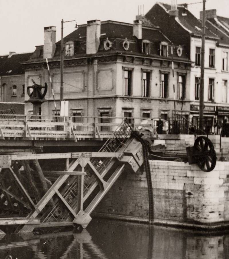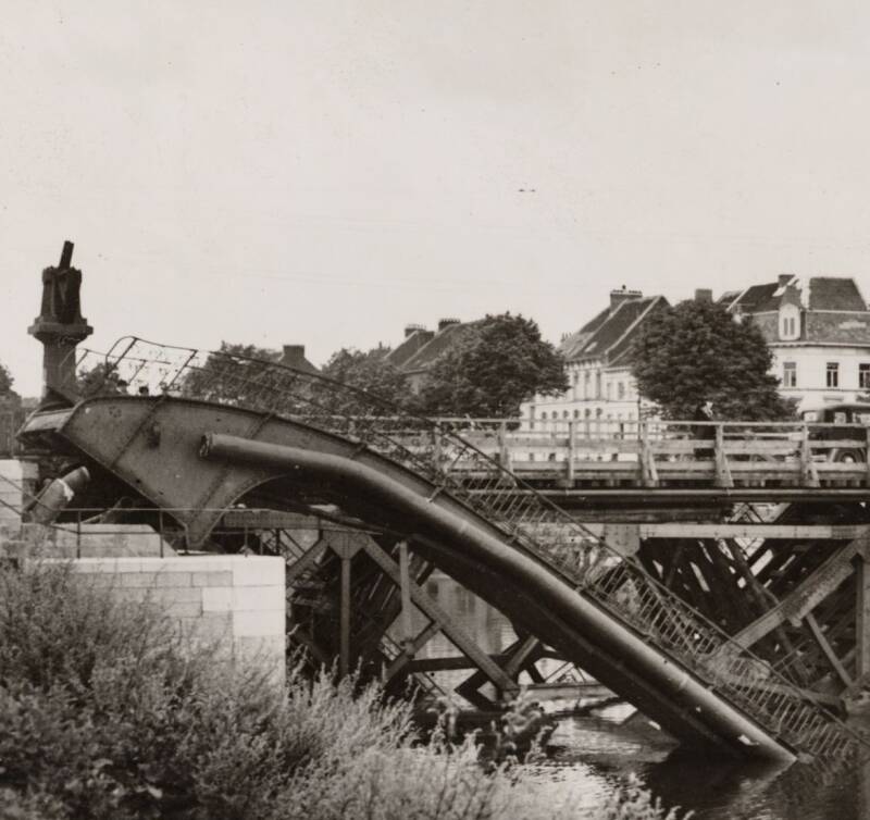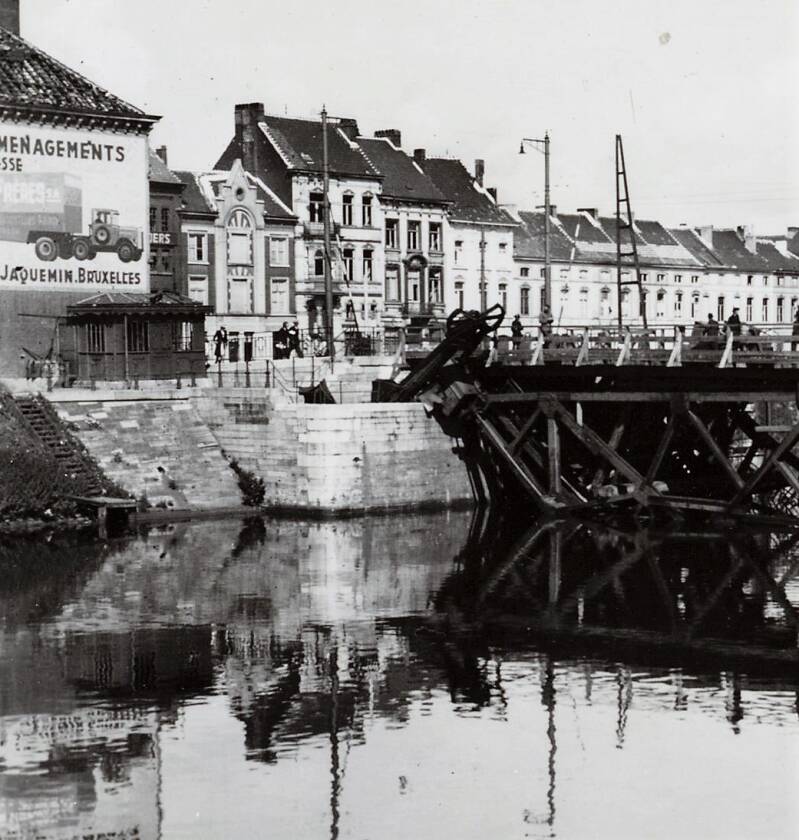 Amper twee jaar later werd de brug opgeblazen (hoe zinloos eigenlijk en wat een geldverspilling en wat al verloren werk). Tijdens de oorlog werd een noodbrug in hout gelegd door de Duitsers.