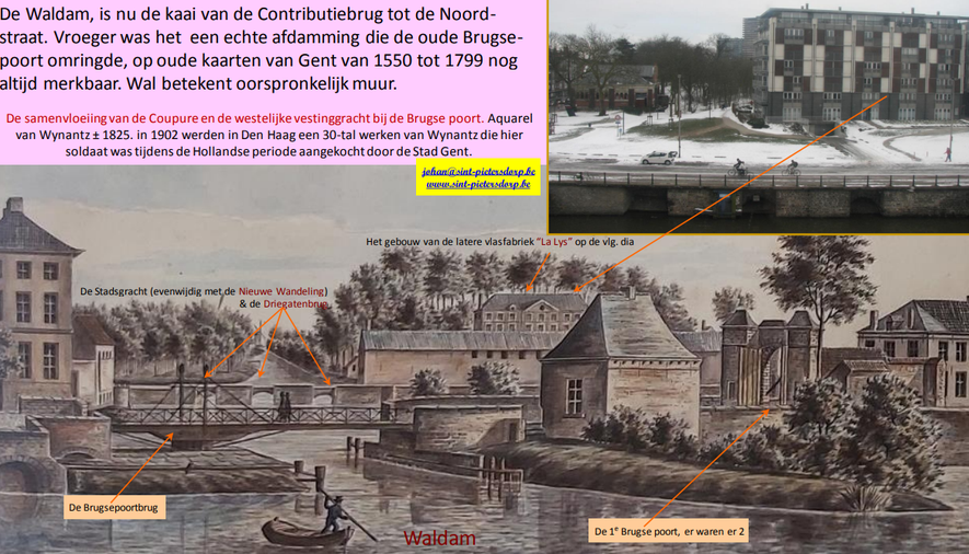 De Driegatenbrug aan de stadsgracht ontstond bij het graven van de Coupure in 1751. Parallel met de loop van de Coupure op het Jan Hembyze Bolwerk, dat deel uitmaakte van Coupure Links, ligt de stenen Driegatenbrug waaronder de vestinggracht liep. De drie gaten zijn nog steeds te zien. Het betonnen brugdek is weggewerkt in het wegdek. De vestinggracht is echter verdwenen. Even verder op de hoek met de leiekaai ligt nog steeds de brug over de Leiearm. Tussen beide bruggen stond een kleine stadspoort Porte de secours of Hulppoort genaamd. De echte stadspoort, de Brugse poort lag aan de overkant nabij de Contributiestraat.