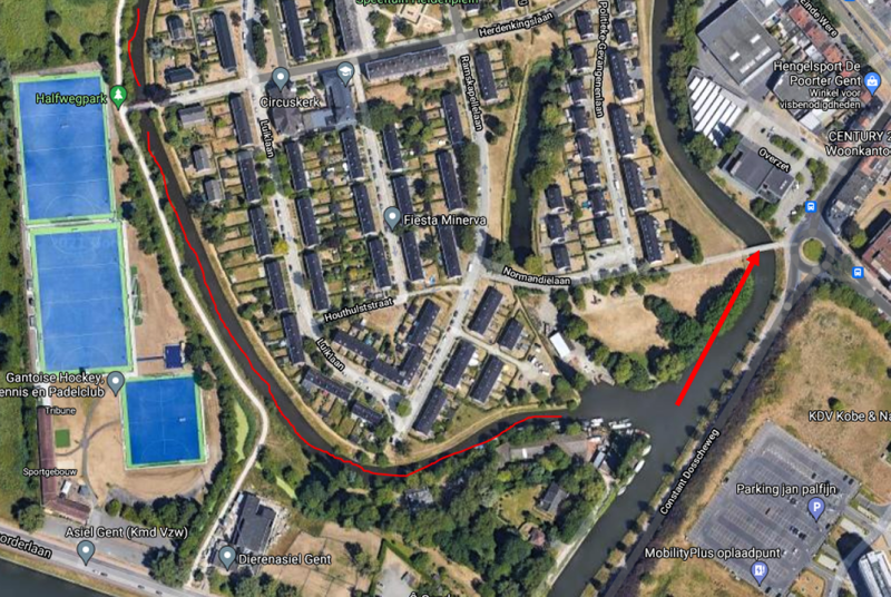 Aan de gewezen overzet over de, in 1972, gedempte arm der Leie, heden de H. Dunantlaan, was er ook een voetbrugje naar het zwembad "Dossche". Het zwembad "Dossche" was de eerste Gentse zwemkom, gesticht in 1838 door de eigenaar Constant Dossche. Deze laatste, geboren in 1811 kreeg de bijnaam "Pruuke Dossche" vanwege zijn weelderige baard en haardos. Hij diende als model voor de uitbeelding van het Neptunusbeeld, dat boven de ingangspoort van de gewezen vismijn staat.