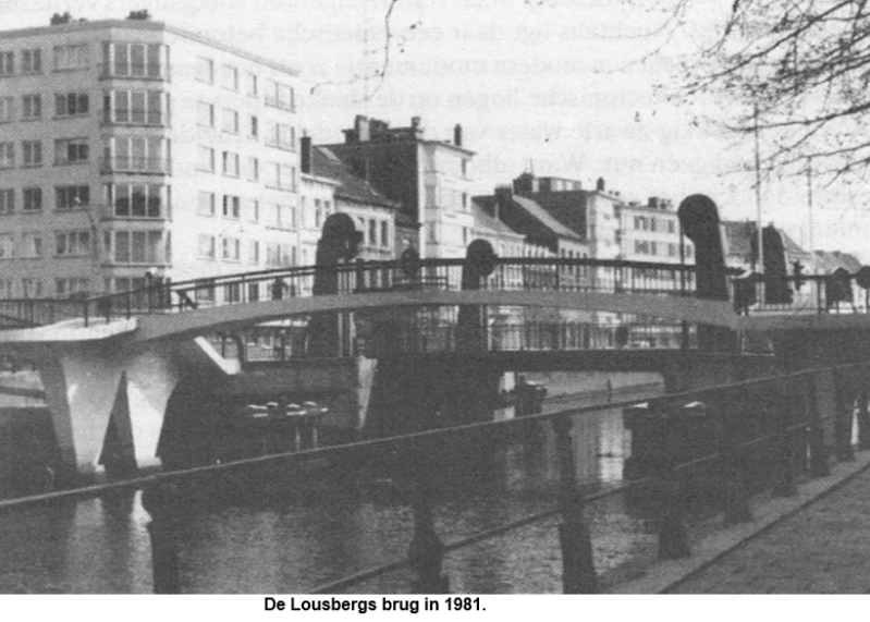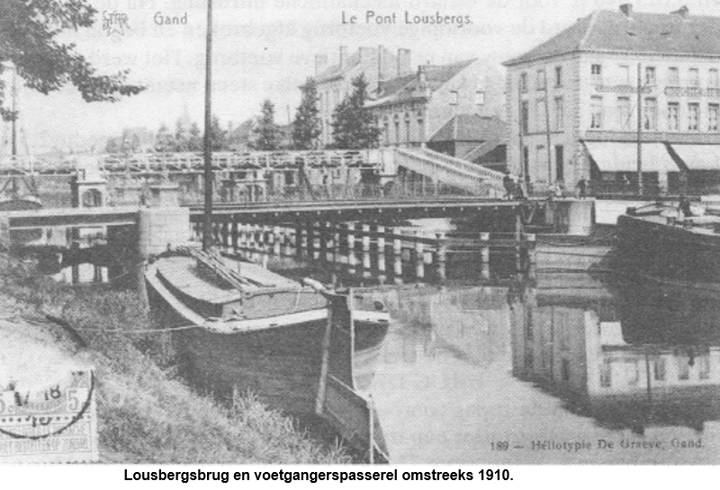 Volgens M. Heins zou de eerste brug dateren van 1817, doch ze is niet terug te vinden op de stadsplannen van Gent van 1825, zodat we mogen aannemen dat de eerste gebouwd werd naar aanleiding van de aanleg van de spoorlijn, welke het Zuidstation met het station aan de Dampoort moest verbinden en de Lousbergsbrug was één der drie bruggen welke door aannemer De Beer in 1856 geplaatst werden.