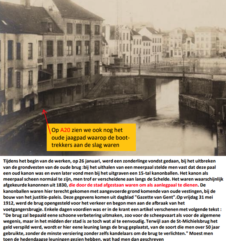Het kanon als meerpaal scheen normaal te zijn, men trof er verscheidene aan langs de Schelde. Het waren waarschijnlijk afgekeurde kanonnen uit 1830, die door de stad afgestaan waren om als aanlegpaal te dienen. De kanonballen waren hier terecht gekomen met aangevoerde grond komende van oude vestingen, bij de bouw van het justitiepaleis.
