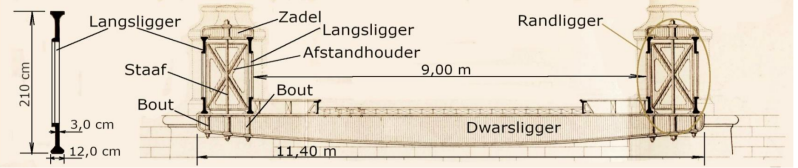 De eerste brug had echter één groot nadeel : ze lag niet in het verlengde van de straat (ze lag haaks t.o.v. de stroom). Dit was dan ook de reden waarom ze al na twintig jaar werd afgebroken om plaats te maken voor een ijzeren brug.