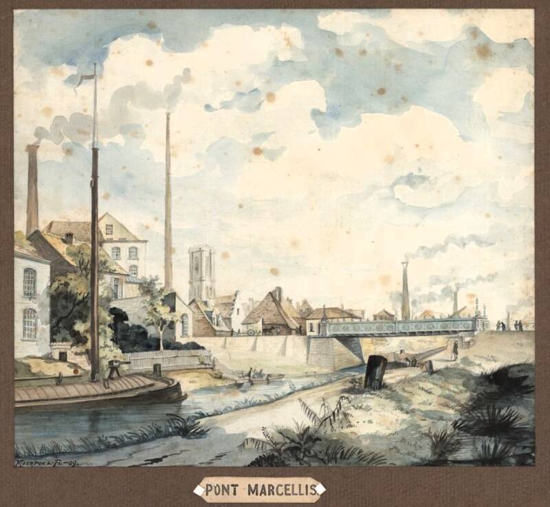 "Terwijl men bezig is met de afbraak der Marcellis brug, achten we het niet ongepast enige woorden over de eerste oprichting dezer mede te delen . Voor vele onzer lezers uit de stad zullen die bijzonderheden nieuw zijn. Sinds lange tijd had de regering van Gent, het voornemen opgevat eene brug over de Schelde te werpen en aldus het kwartier van St-Pieters met de statie van den ijzeren weg te verbinden. Er verliep een tamelijk lange tijd (het kan wel niet anders met stadhuisheren) aleer het opgevatte denkbeeld wierd uitgevoerd , tot dat men eindelijk te rade ging bij de bestuurder der ijzergieterij te Seraing.