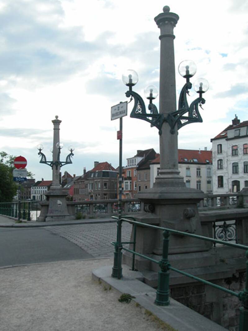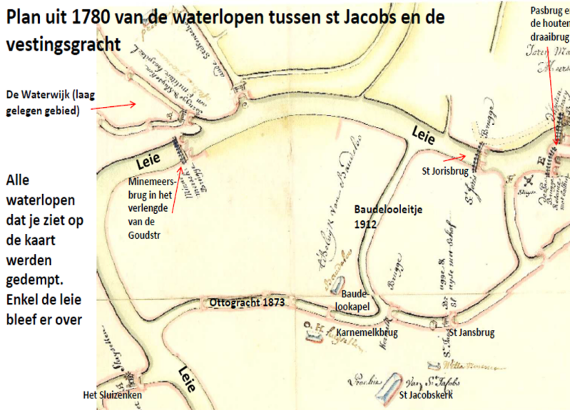 Daarbij komt nog dat de naam van Minnemeersbrug werd gegeven aan twee verschillende bruggen die rechtover elkaar lagen : de eerste een kleine stenen brug, in 1608 het "minnemeers brugskinne" genoemd, dat over de Minnemeersleie lag op het einde der Goudstraat (voorheen Minnestraat geheten) en op het plan van Goethals, anno 1796, vermeld als de "Tooveresbrug" wat in verband met de legende toch wel veelbetekenend is (zie verdwenen bruggen).