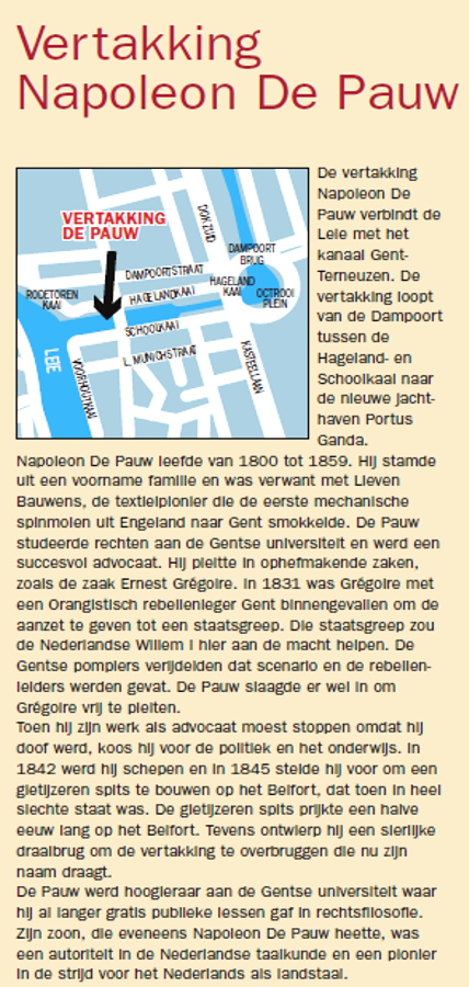 De Pauw Napoleon, geboren te Gent in 1800 en er overleden op 16-10-1859. Hij was schepen van Openbare Werken van 1842 tot 1854. Gent dankt aan hem de bouw van het stapelhuis, de aanleg van nieuwe straten en pleinen, de bouw van de rijschool in de Lange Violettenstraat (waarbij hij waakte op het behoud van het Klein Begijnhof), de herstelling van het Belfort.