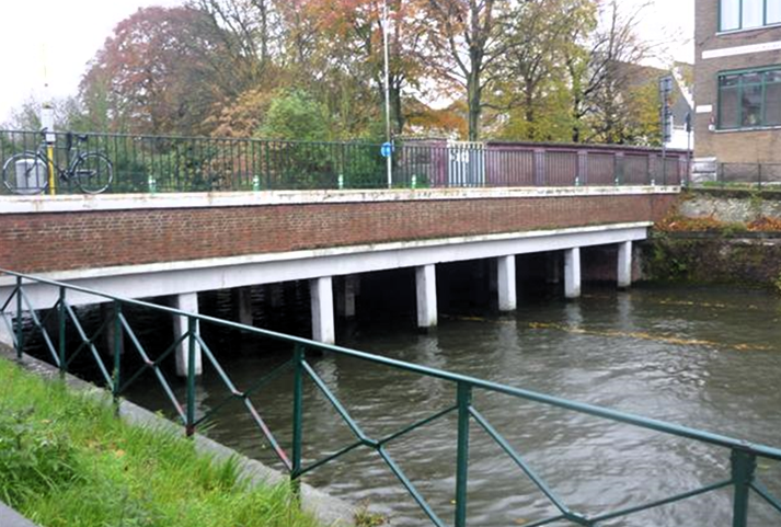 De overbrugging gebeurde met geprefabriceerde, gewapende betonplaten rustend op een roosterwerk van langs- en dwarsbalken, die de koppen van de draagpalen verbinden. Door de verbreding verdween de plaatselijke, zeer hinderlijke versmalling van de vorige brug.