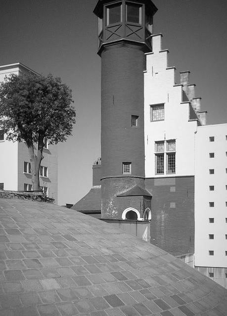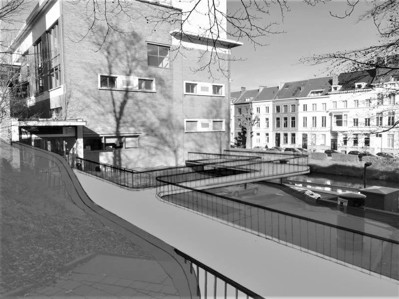Het Emmaüskasteeltje, temidden van groenbeplanting omvat rechts het zogeheten lusthofje, daterend uit de eerste helft van de 16de eeuw met, naar het water toe, een hard gerestaureerde zandstenen trapgevel, aan de westzijde een manke bakstenen trapgevel en ronde aanleunende traptoren.