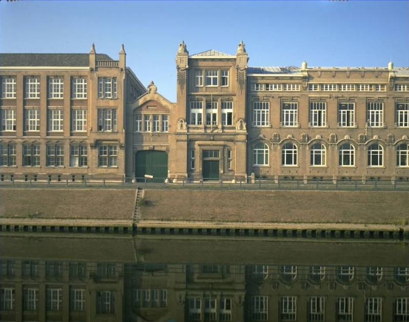 In de gevelwand vallen twee delen te onderscheiden, gesplitst door de overbouwde toegang met topgevel. De rechterpartij (de voormalige bureaus van de fabriek) telt zeven traveeën en is gevat tussen hoger opgetrokken hoekrisalieten. Het middengedeelte hiervan is twee en een halve bouwlaag hoog en heeft rondboogvormige benedenvensters overspannen met een doorlopende waterlijst die de boog van de vensters volgt. In de zwikken bevinden zich cartouches in art deco die oorspronkelijk bedoeld waren om opschriften met de verschillende werelddelen te dragen. De bovenvensters zijn gevat in rechthoekige nissen. Boven de drie middelste traveeën bevindt zich een bekronende attiek, op de bouwaanvraag met het opschrift "services centraux des sociétés anonymes". De hoekrisalieten zijn afgelijnd tussen hoger opgaande pilasters met art deco versiering. De linkerpartij (het voormalig magazijn) telt eveneens zeven traveeën tussen hoekrisalieten maar heeft drie bouwlagen en is eenvoudiger uitgewerkt. Op de begane grond bevinden zich kruiskozijnen en op de bovenverdiepingen rechthoekige nissen waarin de vensters per travee gevat zijn. Ook de hoekrisalieten zijn eenvoudiger met de bovenverdiepingen op overstek en bij het rechterrisaliet bekroond met hoger oplopende pilasters.