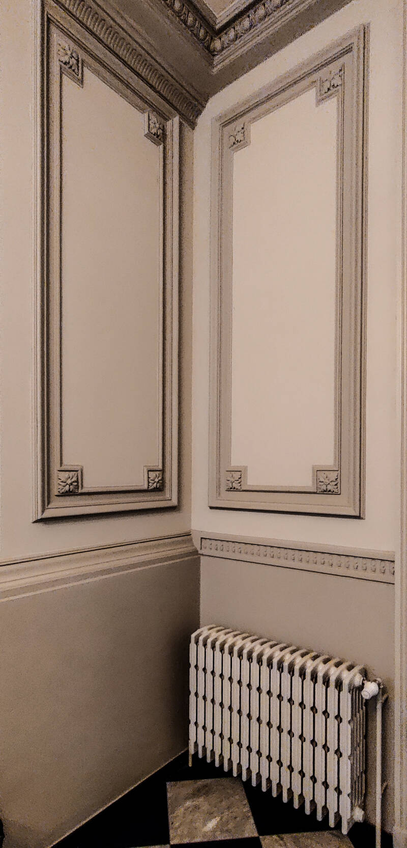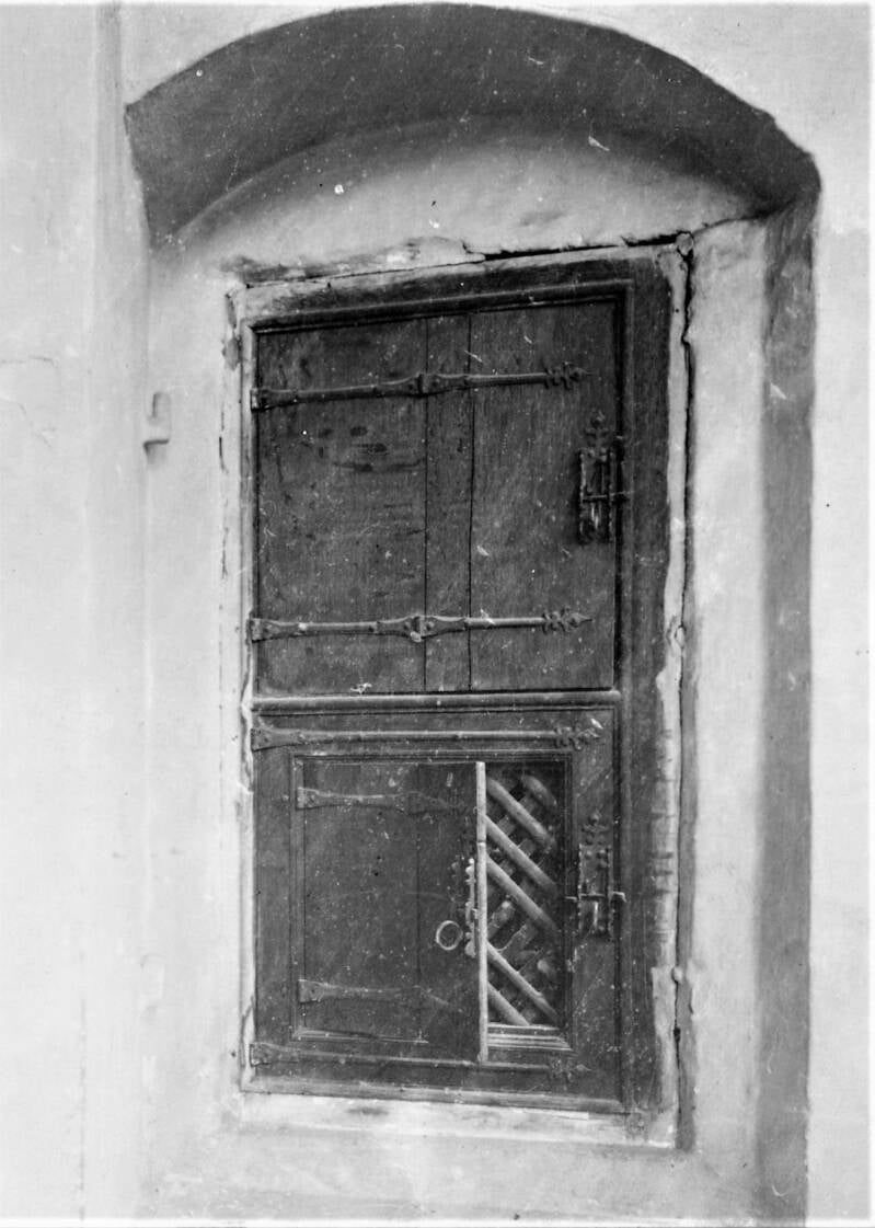 Voor de restauratie van 1912 deed de voorgevel zich voor als een typisch 19de-eeuwse bepleisterde en witgeschilderde lijstgevel met rechthoekige vensters en deur, zoals thans in vierde travee, afgelijnd door kroonlijst.