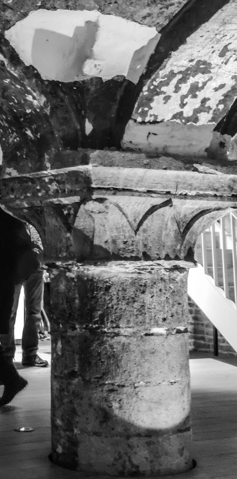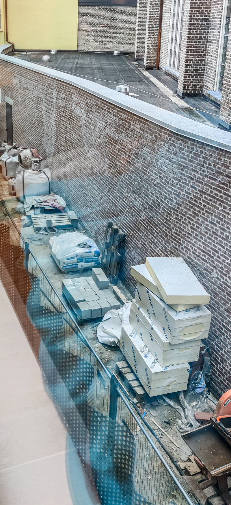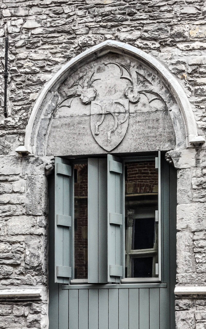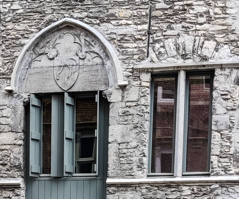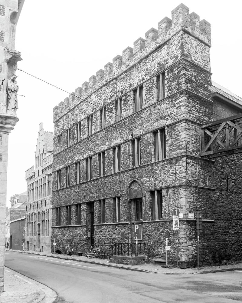 Achtergevel, oorspronkelijk gevormd door drie puntgevels, waarvan slechts een bewaard, gedeeltelijk gebouwd van Doornikse kalksteen en van baksteen.