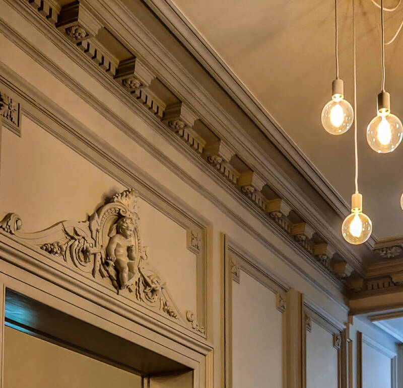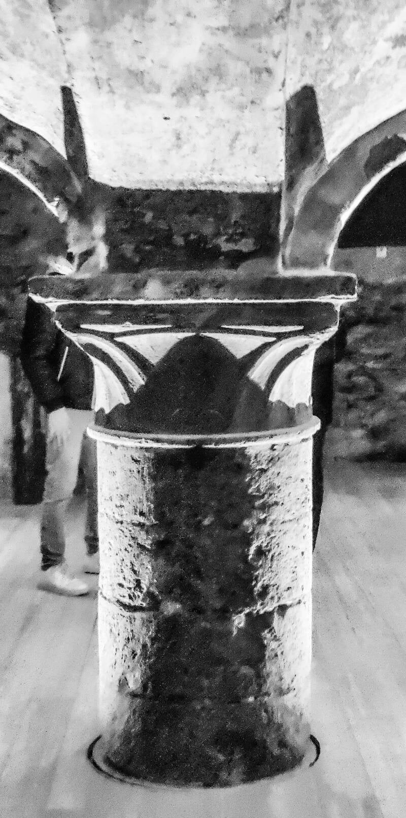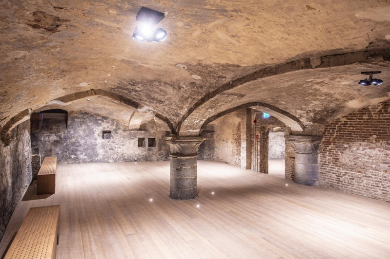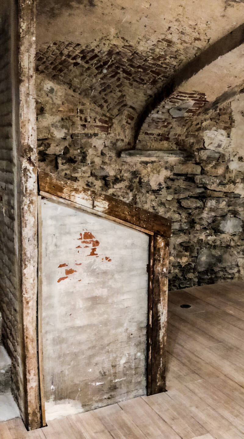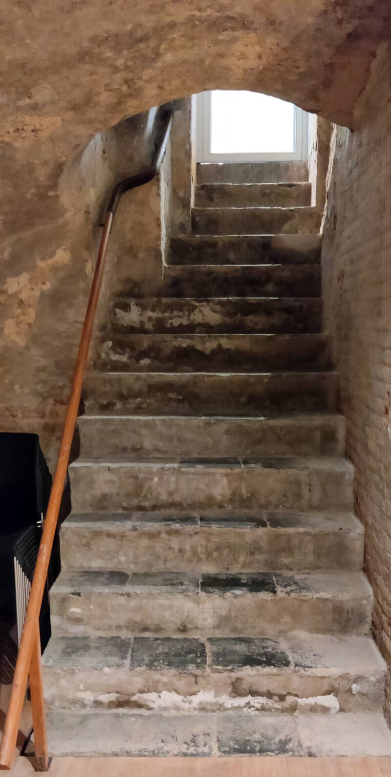 Achtergevel, oorspronkelijk gevormd door drie puntgevels, waarvan slechts een bewaard, gedeeltelijk gebouwd van Doornikse kalksteen en van baksteen.