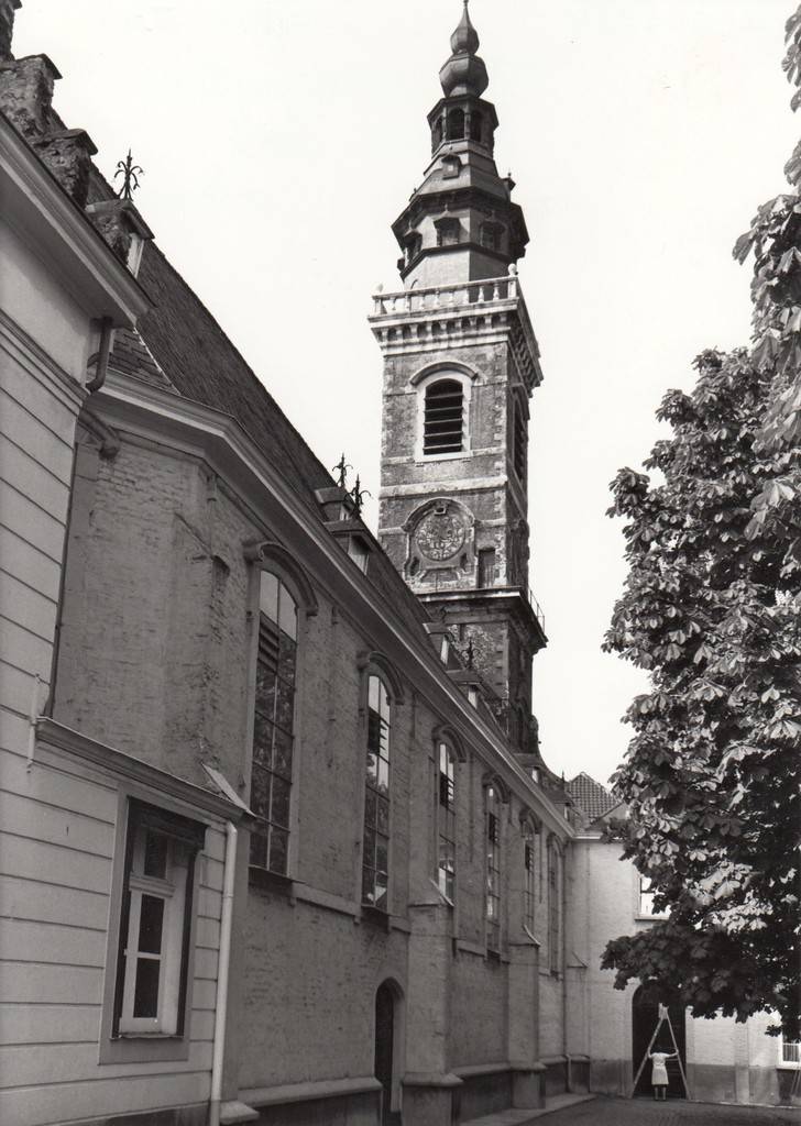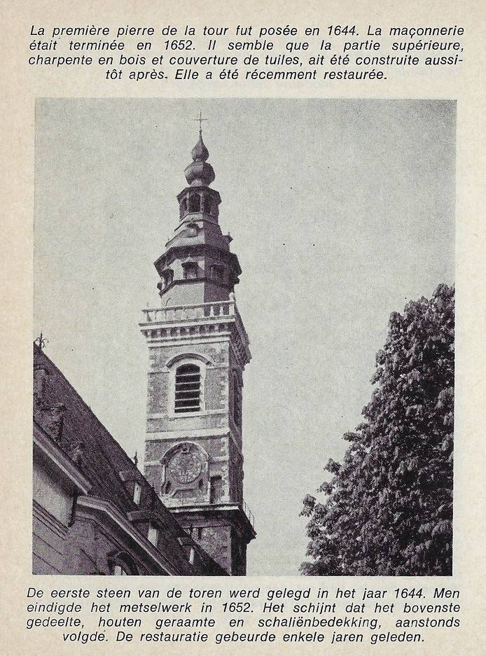Vierkante westtoren met vier geledingen van baksteen en Balegemse zandsteen, afgelijnd door een omlopende geprofileerde lijst, een uitspringende kroonlijst op consoles en tenslotte een balustrade met postamenten bekroond met een bolornament op de hoeken. Daarboven, een octogonale houten romp met leien bekleding verlicht door acht kleine dakkapellen, afgedekt met een koepelvormige bedaking waarop een achtkantige lantaarn volgt met een dubbel ingesnoerde peerspits. Prachtvoorbeeld van barokke bouwkunst. Bakstenen gedeelte, opeenvolgend horloge- en klokkentoren, geleed door omlopende zandstenen banden en voorzien van hoekblokken. De tweede geleding vertoont aan de westkant deels bewaarde vleugelstukken afgelijnd door platte banden welke voorheen op voluten uitliepen; voorts met centrale rondboognis met beeld van Heilige (?), in een geriemde omlijsting met oren, geprofileerde gebroken kroonlijst onder een sterk verweerde zandstenen cartouche (?). De zuid- en noordkant zijn versierd met een blind omlijst steekboogvenster met gebogen druiplijst onder gelijkaardige eveneens sterk verweerde cartouches, noordkant gedateerd 1761 boven het steekboogvenster. Brede omlopende geprofileerde kroonlijst voorheen met balustrade, heden vervangen door een eenvoudige ijzeren leuning. De derde geleding toont aan elke zijde een ronde horlogeplaat in een zandstenen omlijsting met gebogen druiplijst. Vierde geleding met steekboogvormige galmgaten in een vlakke zandstenen omlijsting met oren en gebogen druiplijst. Werd sinds 1969 gerestaureerd met Massangissteen.