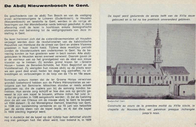 Oprichting in 1204 van een gemeenschap van religieuzen door Geertrui en Fulco van de befaamde Gentse patriciërsfamilie Utenhove. Hun klooster te Lokeren naar de plaats zogenaamd "den Oudenbosch" wordt in 1215 als cisterciënzerinnenabdij erkend. Ook zogenaamd Onze-Lieve-Vrouw ten Bosch, Sancta Maria de Bosco en ook Nonnenbosch. Overplaatsing van het klooster naar Heusden bij Gent in 1247. Vanaf 1307 vermeld onder de naam Nieuwen-Bosch. Tijdens de godsdiensttroebelen in 1578 worden de kloosterlingen verjaagd. Vinden elkaar in 1584 terug in hun refugiehuis te Gent. Tussen 1584 en 1594 verwerft de abdis verscheidene huizen en stukken grond in een wijk de zogenaamd "Groene Hoye" tussen Nederschelde en Opperschelde, begrensd door het Klein Begijohof en de Lange Violettestraat. Nemen in 1598 hun intrek op de "Groene Hoye" en beginnen aan de opbouw van de kloosterkerk die in 1600 door de bisschop van Gent wordt ingewijd. Eind 1796 worden de cisterciënzerinnen verjaagd en hun klooster openbaar verkocht. Kort nadien wordt er ondermeer een school in ondergebracht en een katoenfilature die in 1820 uitbrandt. De congregatie van de zusters van Onze-Lieve-Vrouw van Namen, gesticht door de Heilige Julie Billiart, bezat sinds 1809 een armenschool in de Sint-Pietersnieuwstraat en richt in 1809-1810 een tweede op in een gedeelte van de gebouwen van de abdij van Nieuwen-Bosch. In de loop der jaren betrekken zij alle gebouwen van de voormalige abdij. Hun klooster en onderwijsinstelling bleef er tot op heden gevestigd.