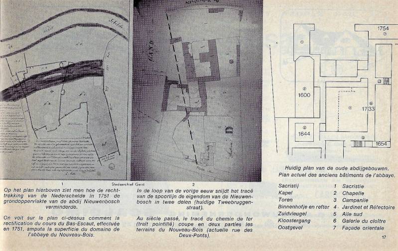 Grotendeels behouden 17de-eeuwse gebouwen, met uitzondering van het gesloopte kwartier van de abdis en de in begin 19de eeuw door brand vernielde gebouwen. De oude kloostergang bestond uit rondom een niet volledig gesloten rechthoekig hof gerangschikte panden en een kapel met westtoren aan de noordelijke kant van de hof. De kapel werd aanzienlijk verfraaid eind tweede kwart 17de eeuw. In de 18de eeuw werden de overige kloostergebouwen vergroot en verbouwd naar ontwerp van architect Bernard De Wilde. Vrij uitgestrekte hovingen bevonden zich aan de oostelijke en zuidelijke kant. In 1751 ging een deel van de gronden aan de oostkant verloren bij het rechttrekken van een bocht aldaar in de Nederschelde. Van begin 19de eeuw af werden de gebouwen aan hun nieuwe functie aangepast. Uitbreiding met nieuwe vleugels voor schoollokalen voornamelijk midden 19de eeuw op de westkant van het terrein tussen de oude abdijgebouwen en de Lange Violettestraat. Door het trekken van de spoorlijn en de aanleg van de Vander Bruggensteeg, later Tweebruggenstraat, in 1857, werd een gedeelte van het gebied van Nieuwen-Bosch afgescheiden; een overdekte doorgang over de straat voorzag in een verbinding met de geïsoleerde gebouwen van de abdij. Tegen de zuidmuur kwam een bakstenen nieuwe bouw midden derde kwart 20ste eeuw tot stand terwijl aan de westkant ook lokalen toegevoegd werden. Eind 1977 kwam een nieuwe bouw aan de Lange Violettestraat klaar die het grootste gedeelte van de vroegere voortuin aldaar beslaat.