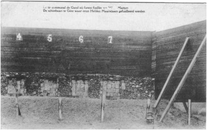 Tussen 1914 en 1918 kwamen er 52 mensen om door executie. Ferdinand Lenoir werd als eerste persoon terechtgesteld. Dit gebeurde zonder de toestemming van Wilhelm II. Sindsdien eiste de Keizer dat hij op de hoogte zou zijn van de executies. Zo kreeg Graaf Joseph de Hemptinne gratie van de keizer omdat hij een adellijke titel had. Octaaf Declerq, een priester en onderpastoor in de Sint-Pieters-buitenparochie werd wegens het vervalsen van papieren gefusilleerd op 11 augustus 1916. Het moment voor de executie kreeg de veroordeelde de kans om nog iets te zeggen. Hij zei “ik heb maar van één ding spijt, dat ik niet meer voor mijn vaderland heb kunnen doen.” In 1920 is hij herbegraven in Merelbeke. Edmond van de Woestyne is als laatste persoon terechtgesteld en dit een maand voor het einde van de oorlog. Van de 52 mensen zijn er drie vrouwen geëxecuteerd: