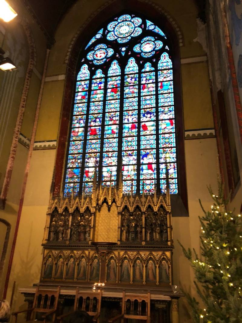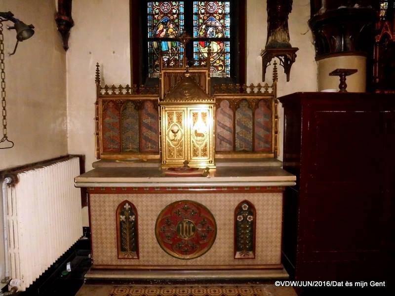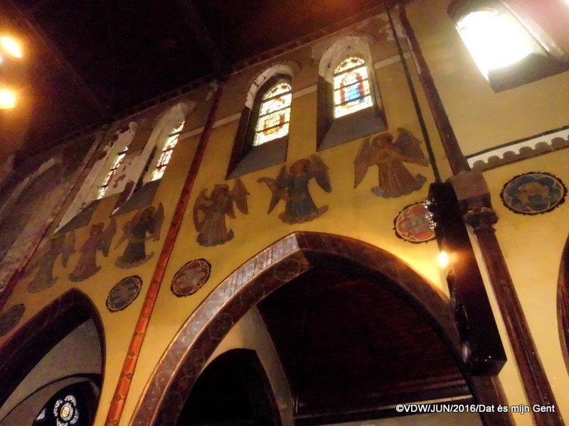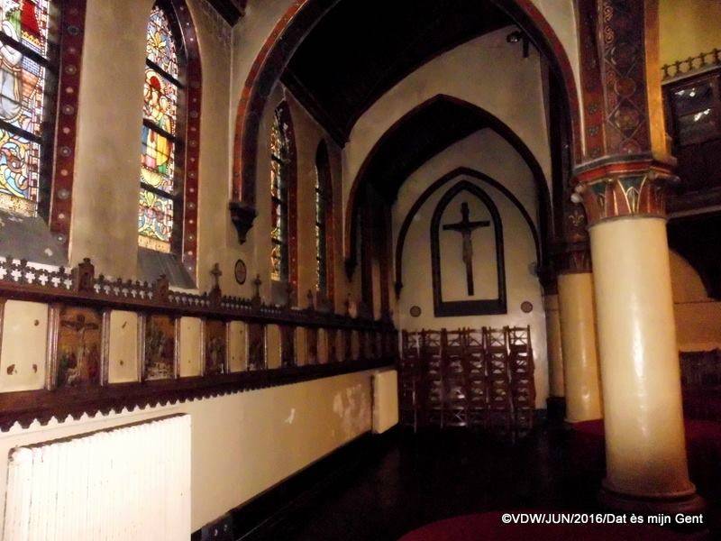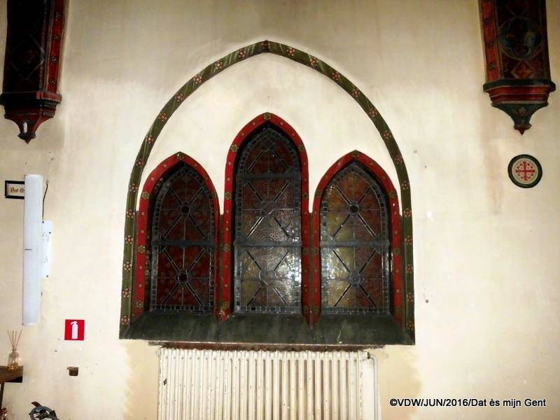 In dezelfde periode richtte men onder leiding van Bethune en met steun van een aantal mecenassen de kapel in. Het atelier van Bethune leverde in 1875 het grote koorglasraam. Kort nadien nam Verhaegen dit atelier over en leverde in de periode 1876 -1893 een hele reeks kleinere ramen naar ontwerp van Bethune. Verhaegens opvolger Joseph Casiers vulde later deze reeks verder aan. De rest van de aankleding werd uitgevoerd door Bethunes vaste medewerkers. Schilder Adriaen Bressers polychromeerde de wanden van de kapel.