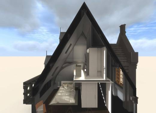 De torenkamer wordt een duplex, met badkamer en sanitair op de onderste verdieping en de ruimte erboven als slaapkamer. In de toren zitten overal vensters, dus als je rondkijkt, zie je in de verte de haven met windmolens en koeltorens, de schouw van de centrale in de Ham en de Rabottorens. Je kijkt uit over de Korenmarkt, over de Sint-Michielshelling en over de daken aan de kant van de Predikherenlei. De grijze gevel van de Sint-Niklaaskerk lijkt vlakbij.