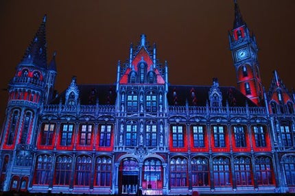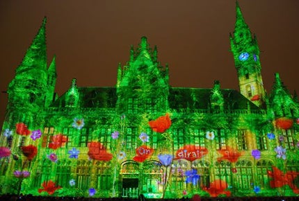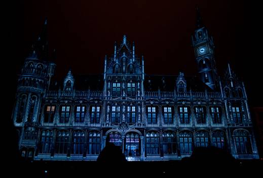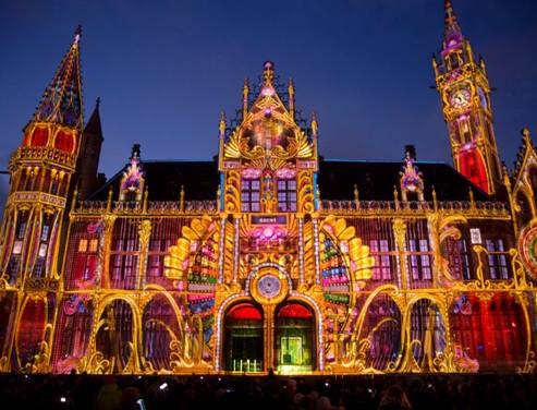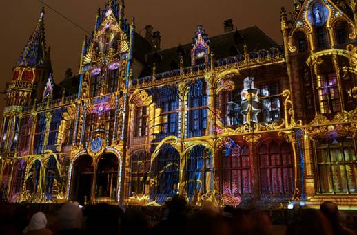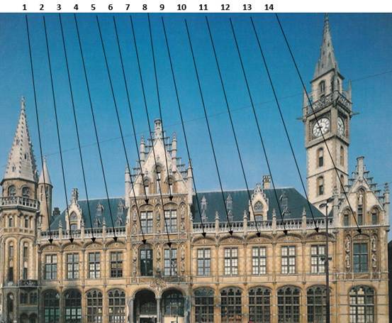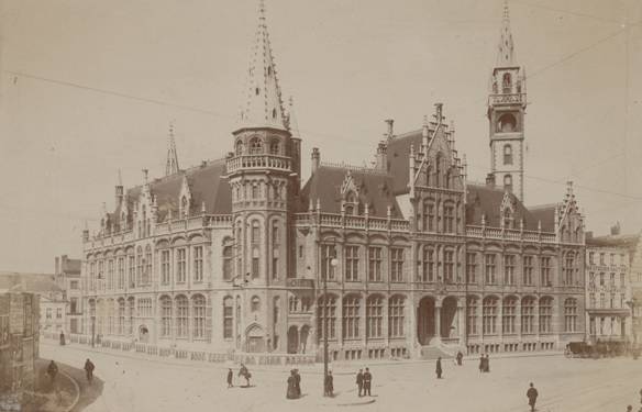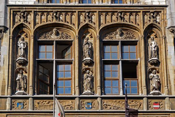 De gevels zijn versierd met beelden en wapenschilden, deze stellen België, Vlaanderen, Wallonië, de 9 provincies en de 23 toenmalige Europese staatshoofden voor. Het zijn er ongeveer 100 in het totaal. Het gebouw heeft achthoekige torens met spitsen, waaronder de traptoren op de hoek met de Sterrenstraat en de toeganspartij ook met traptoren aan de Korenmarkt. Verder springt de 52 meter hoge uurwerktoren in het oog. Aan de kant van de Korenmarkt zien we 5 beelden die verwijzen naar de 5 werelddelen. De beelden werden gekapt door beeldhouwer Geo Verbanck (1881-1961).