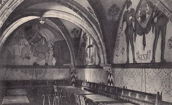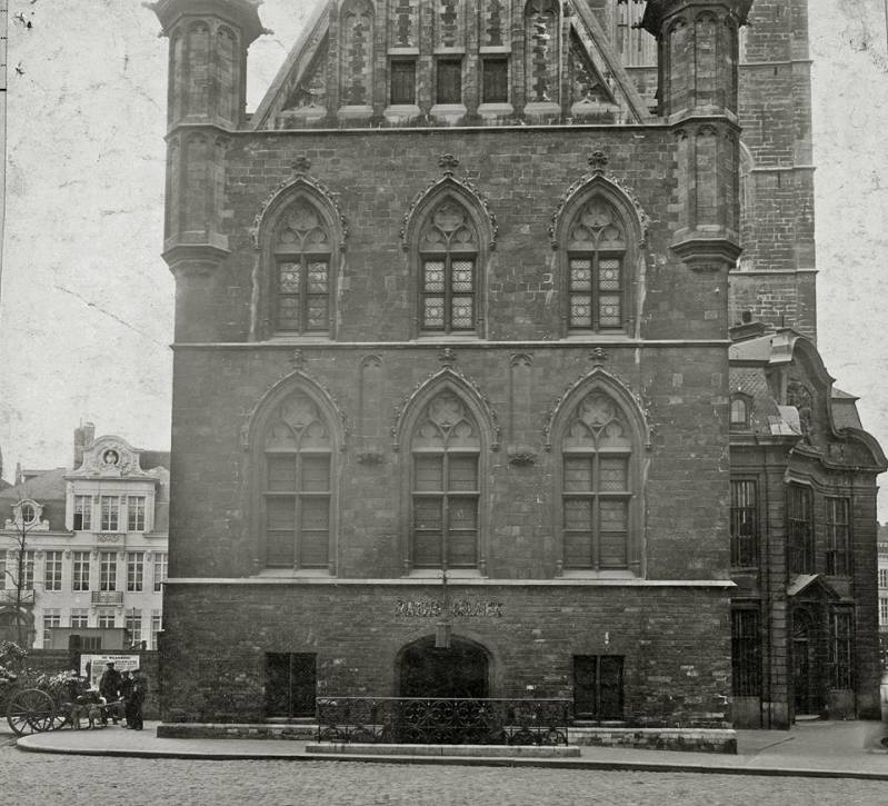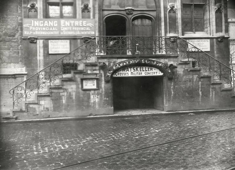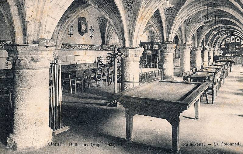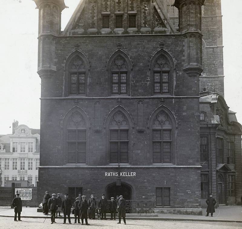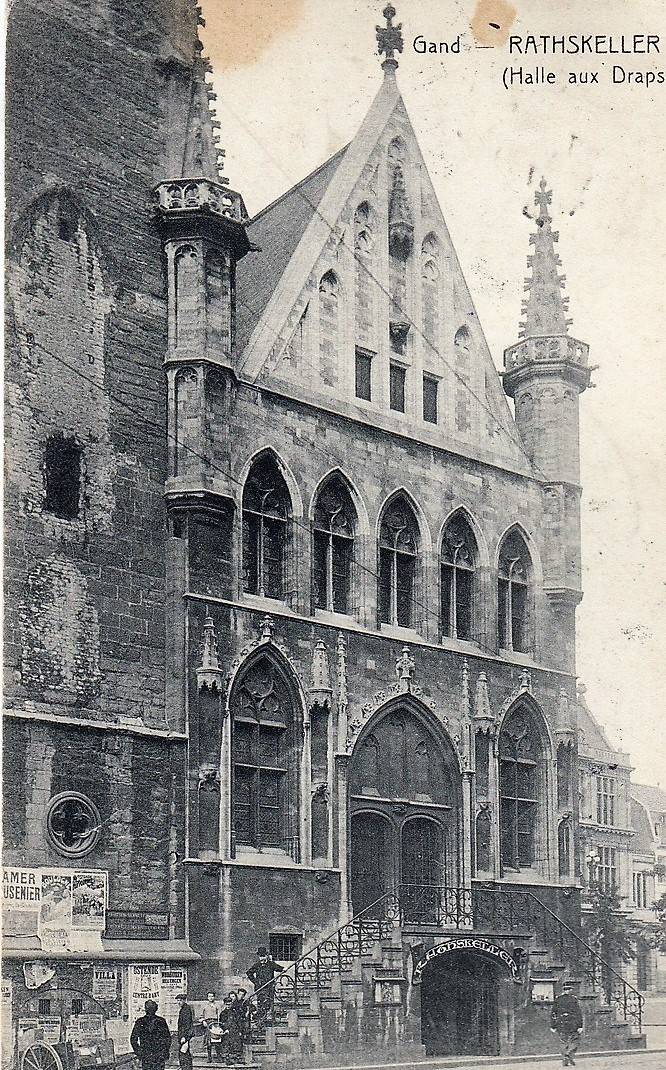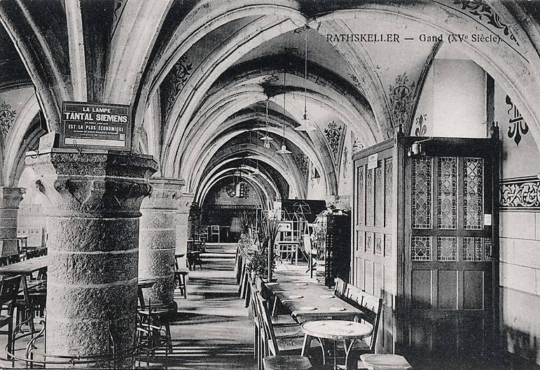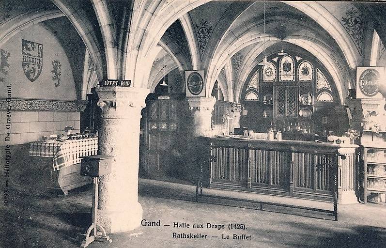 We schrijven "Raadskelder", maar de oorspronkelijke naam was "Rathskelder". De naam werd natuurlijk vernederlandst na 1918. In 14 25 werd begonnen met de bouw van de huidige Lakenhal aanleunend aan het Belfort dat in de 14° eeuw werd gebouwd. Wegens geldgebrek echter werd de bouw in 1445 stopgezet : alzo werden slechts zeven traveeën van de elf voorziene traveeën uitgevoerd. De gevel zijde Sint-Baafsplein was onzichtbaar tot in 1899, toen de huizen van de Sint-Janstraat en de Regnessestraat werden afgebroken voor de aanleg van het Sint-Baafsplein. In 1903 werden vier traveeën bijgebouwd en was het oorspronkelijke ontwerp voltooid. De idee op het gelijkvloers een drankhuis in te richten kwam van de brouwerij van Akkergem, die gelegen was op het einde van de Nieuwe Wandeling. Dit naar het voorbeeld van Duitsland, waar in heel wat steden onder het stadhuis een "Bierhalle" was ingericht. De eigenaars spaarden zich noch moeite noch kosten om hun "Rathskeller" degelijk in te richten. Het plan werd getekend door architect J anssens; de versiering van de muren is het werk van kunstschilder Comelis. Het maken van de gotische meubels werd toevertrouwd aan de meubelmakers Cynaeve, Goethyn en Poppe. De glasramen zijn van Ganton en het ijzerwerk van Coppejans. Aan het geheel wenste men een middeleeuws karakter te geven. In het drankhuis werd Pilsen en Munich verkocht, bieren met lage gisting en gebrouwen door de brouwerij Akkergem, dit in tegenstelling met de Gentse uitzet en tripel, die bieren zijn met hoge gisting. 's Avonds en sommige namiddagen speelde een orkest, "Les sacrifices qu'elle s'est imposés ont fait de ce café-restaurant non seulement une curiosité, mais une maison de tout premier ordre" schreef in 1906 George M. J ohson in Le Petit Joumal du Brasseur. Uit de begroting van 1905 van de stad Gent blijkt, dat het lokaal werd verhuurd aan de brouwerij van Akkergem voor een periode van achttien jaar met ingang van 1 januari 1905 voor een bedrag van 2 320 fr. per jaar, verwarming inbegrepen.