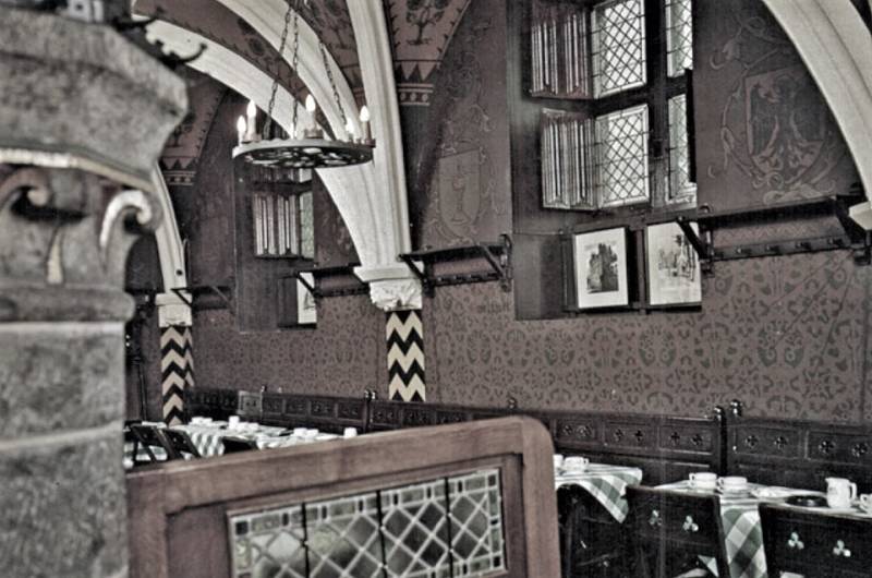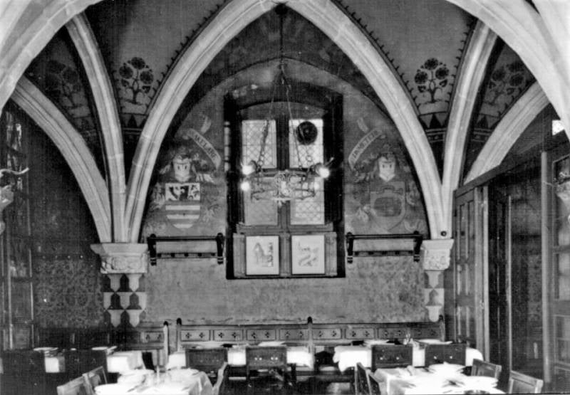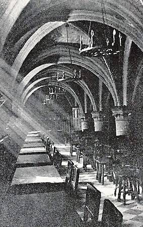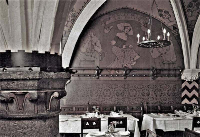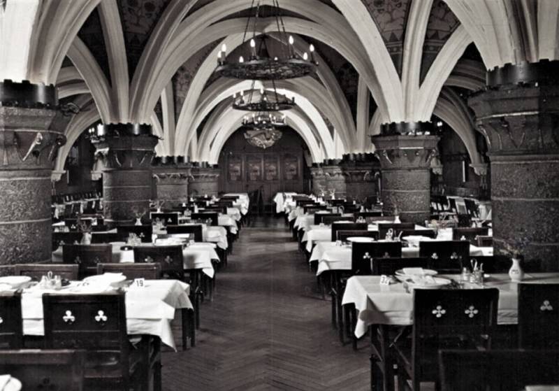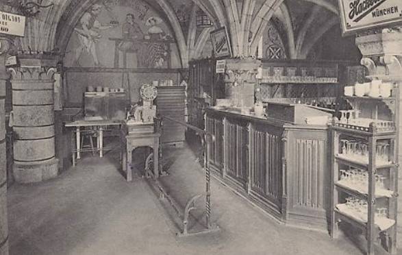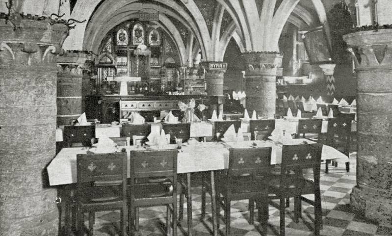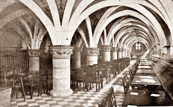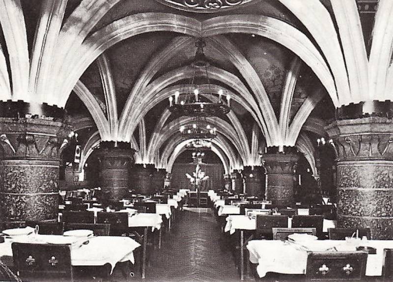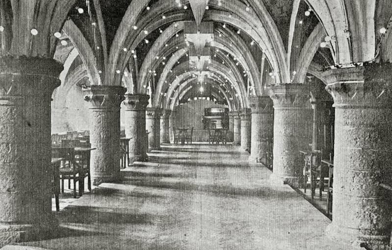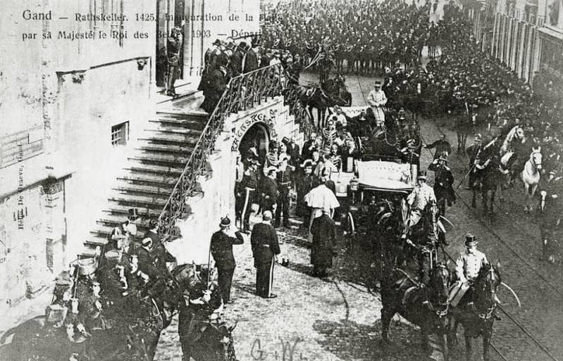 We schrijven "Raadskelder", maar de oorspronkelijke naam was "Rathskelder". De naam werd natuurlijk vernederlandst na 1918. In 14 25 werd begonnen met de bouw van de huidige Lakenhal aanleunend aan het Belfort dat in de 14° eeuw werd gebouwd. Wegens geldgebrek echter werd de bouw in 1445 stopgezet : alzo werden slechts zeven traveeën van de elf voorziene traveeën uitgevoerd. De gevel zijde Sint-Baafsplein was onzichtbaar tot in 1899, toen de huizen van de Sint-Janstraat en de Regnessestraat werden afgebroken voor de aanleg van het Sint-Baafsplein. In 1903 werden vier traveeën bijgebouwd en was het oorspronkelijke ontwerp voltooid. De idee op het gelijkvloers een drankhuis in te richten kwam van de brouwerij van Akkergem, die gelegen was op het einde van de Nieuwe Wandeling. Dit naar het voorbeeld van Duitsland, waar in heel wat steden onder het stadhuis een "Bierhalle" was ingericht. De eigenaars spaarden zich noch moeite noch kosten om hun "Rathskeller" degelijk in te richten. Het plan werd getekend door architect J anssens; de versiering van de muren is het werk van kunstschilder Comelis. Het maken van de gotische meubels werd toevertrouwd aan de meubelmakers Cynaeve, Goethyn en Poppe. De glasramen zijn van Ganton en het ijzerwerk van Coppejans. Aan het geheel wenste men een middeleeuws karakter te geven. In het drankhuis werd Pilsen en Munich verkocht, bieren met lage gisting en gebrouwen door de brouwerij Akkergem, dit in tegenstelling met de Gentse uitzet en tripel, die bieren zijn met hoge gisting. 's Avonds en sommige namiddagen speelde een orkest, "Les sacrifices qu'elle s'est imposés ont fait de ce café-restaurant non seulement une curiosité, mais une maison de tout premier ordre" schreef in 1906 George M. J ohson in Le Petit Joumal du Brasseur. Uit de begroting van 1905 van de stad Gent blijkt, dat het lokaal werd verhuurd aan de brouwerij van Akkergem voor een periode van achttien jaar met ingang van 1 januari 1905 voor een bedrag van 2 320 fr. per jaar, verwarming inbegrepen.