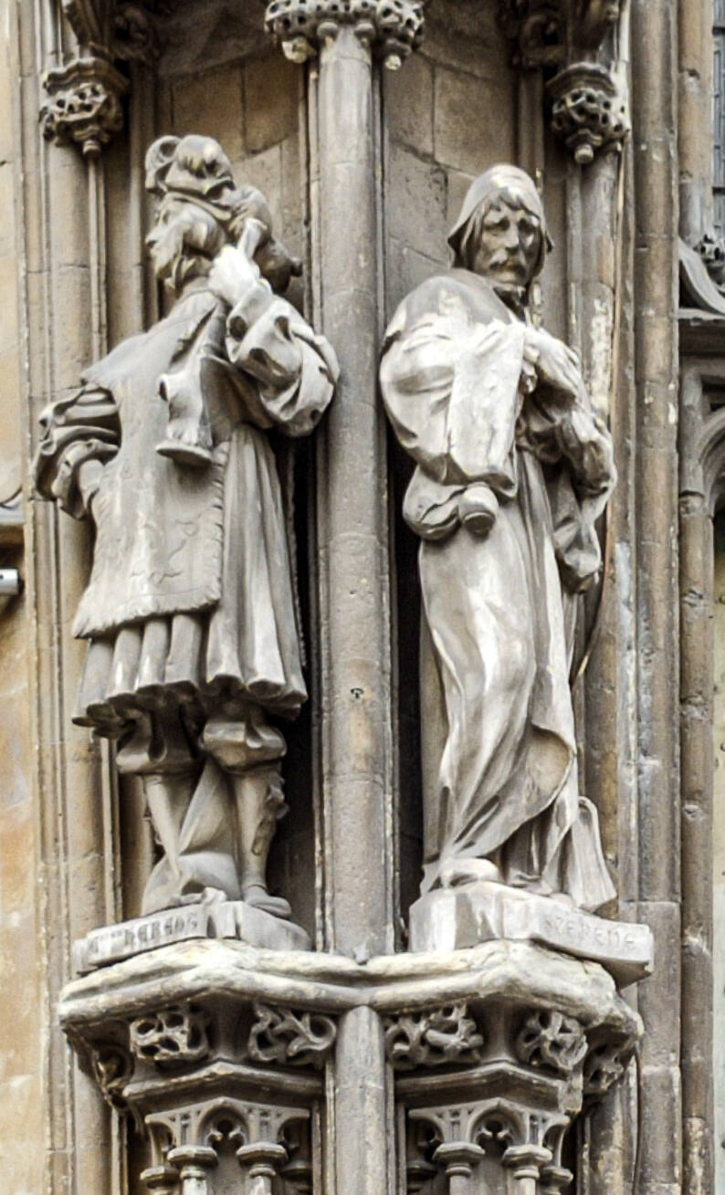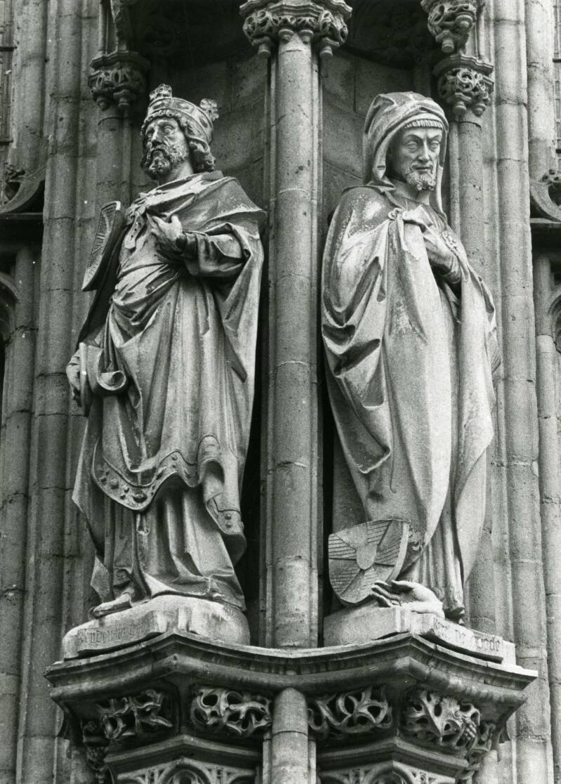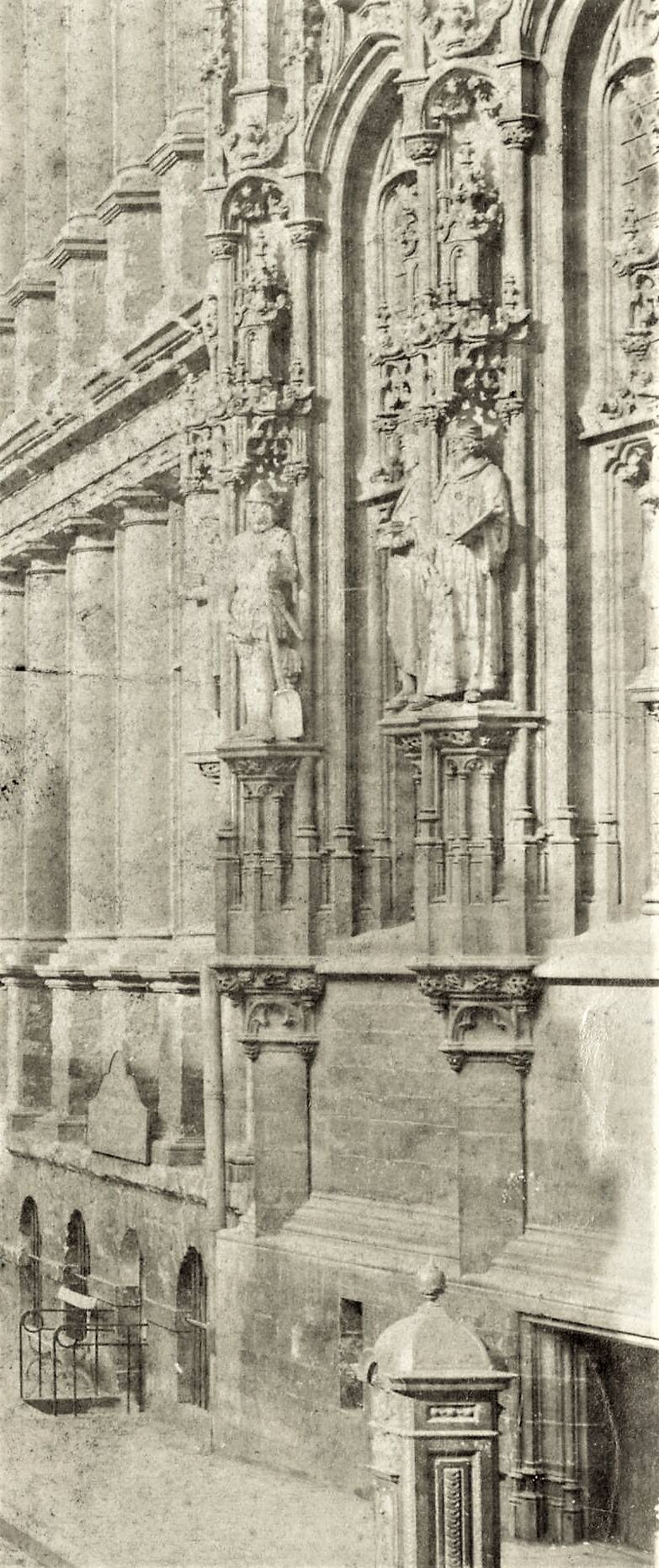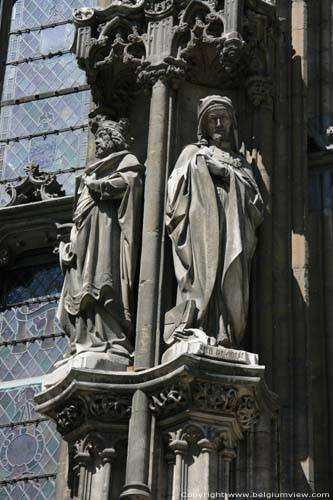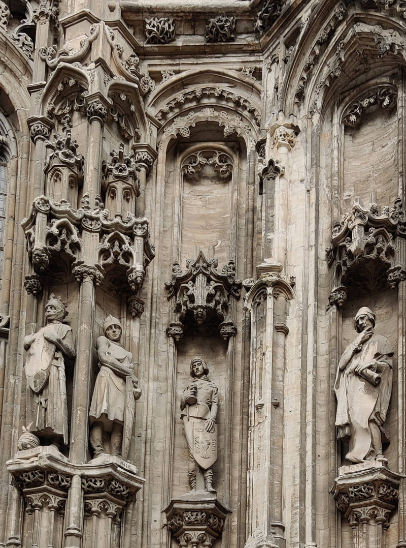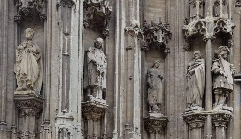 Dit was een pertinente opmerking en Dillens werd gevraagd de graven te sculpteren. In 1902 plaatste men drie stenen beelden van zijn hand in de nissen. Ze staan er nog steeds en stellen keizer Karel, Isabella van Portugal en Margaretha van Oostenrijk voor (de beelden voorstellende keizer Karel en Margaretha van Oostenrijk zijn echter recente (2000 - keizer Kareljaar) replica's in polyester). Later volgden er nog vier beelden. Wanneer Dillens in 1905 overlijdt zullen naar zijn plannen nog enige beelden gekapt worden en ook enige andere beeldhouwers mochten werk leveren. Uiteindelijk zullen van de 54 geplande beelden er 19 tot stand komen. Naast enkele graven van Vlaanderen geeft het geheel een caleidoscopisch overzicht van personages uit de verschillende geledingen van de 'middeleeuwse' maatschappij. Ze zijn te identificeren aan de hand van de gebeeldhouwde 'naamkaartjes' op het voetstuk van de beelden. We onderscheiden: