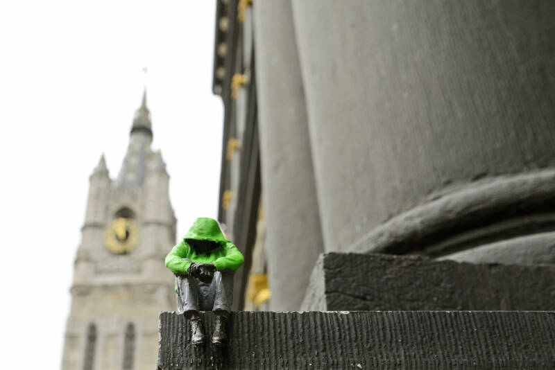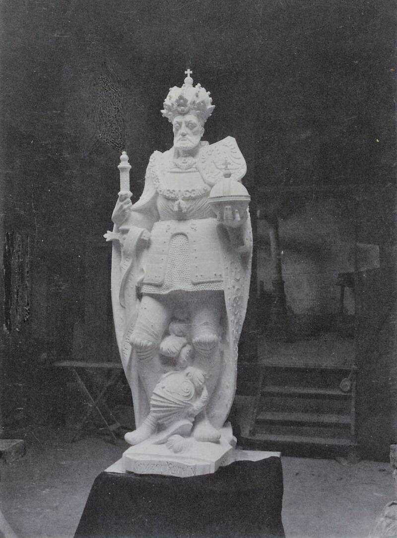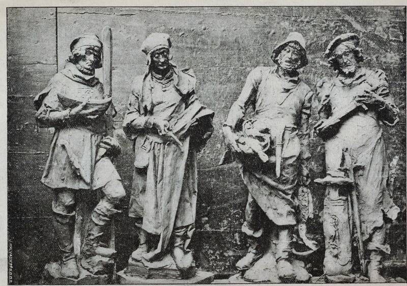 Het voorstel werd gunstig onthaald en een commissie werd in het leven geroepen. Voor de financiering werd volgend schema uitgedokterd: jaarlijks zouden a rato van 1500 frank drie beelden vervaardigd worden en daar er 54 beelden te plaatsen waren zou men na achttien jaar de klus geklaard hebben. Louis Van Biesbroeck had in 1889, in opdracht van de commissie, de eerste twee in metaalcement gegoten beelden bij wijze van proef ten toon te stellen. Ze stelden een wapensmid en een edelsmid voor. Daar ze voor iedereen te zien waren mengde de publieke opinie zich in deze aangelegenheid en de kritiek was vernietigend. Ook een derde beeld van Van Biesbroeck, dat nochtans tegemoet wou komen aan de kritiek, werd gekelderd. Enige andere Gentse beeldhouwers -waaronder de gebroeders Aloïs en Emile De Beule- sprongen dan op de kar en plaatsen in de nissen op eigen kosten en verantwoordelijkheid enige proefbeelden. Niettegenstaande de publieke opinie nu gunstig reageerde, vond de commissie er maar niets aan.