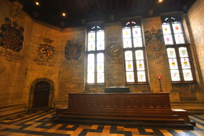 De gids nam ons mee naar de Pacificatiezaal waar ze de geschiedenis vertelde over de Schepenen van de Keure, over de kelder, de beul, de verhalen achter de doolhofvloer enz.