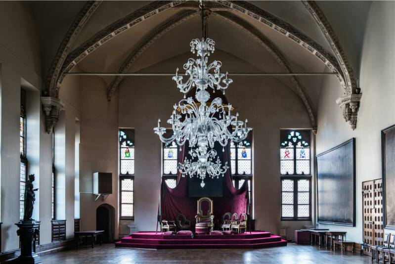 Als laatste bezoeken we de Troonzaal, via de Gotische keuken (nu een vergaderzaal). De Troonzaal is een imposante, mooie zaal met mooie grote lusters, schilderijen en vooral dé Troon. De Troon ziet er nu wel al wat stoffig uit en getuigt van een vergane glorie, maar interessant zijn toch wel de verhalen over Napoleon en dergelijke die Gent bezocht hebben.