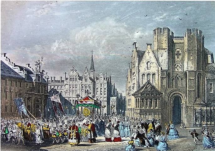 Op het St.- Veerleplein zien we nog het poortje van het godshuis versierd met het beeld van de H. Laurentius.