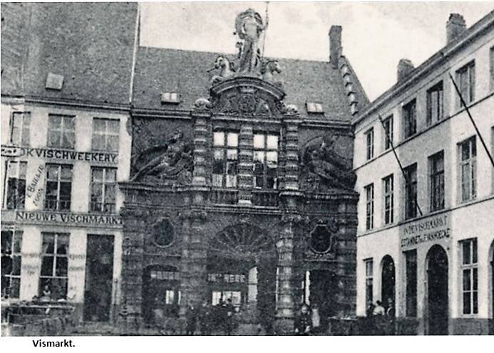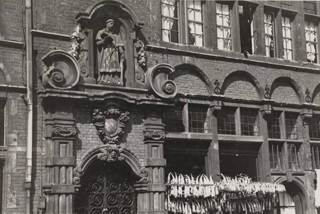 De gevel van de Vismarkt, die uitgeeft in de Rekelingestraat, werd herbouwd in 1912 naar de