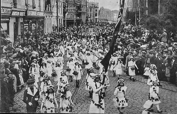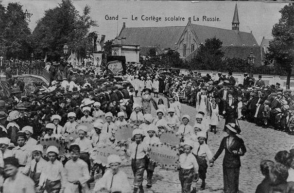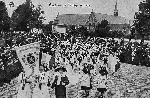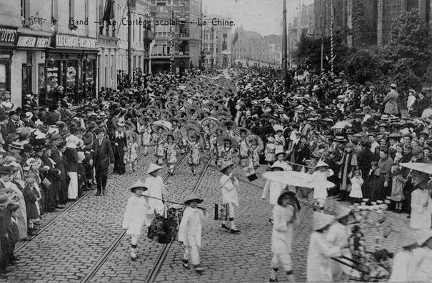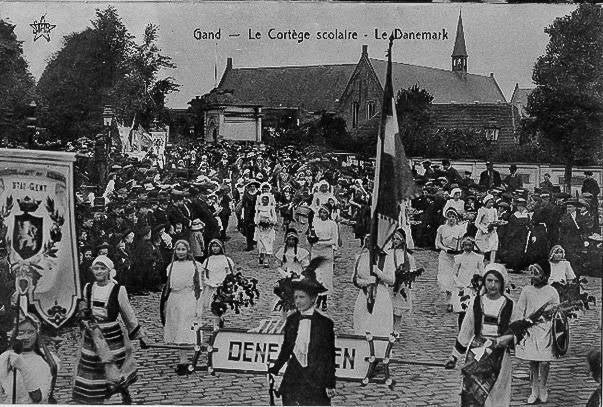 Stoet uit 1913 waarbij scholen landen wereldwijd uitbeelden.