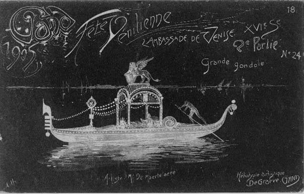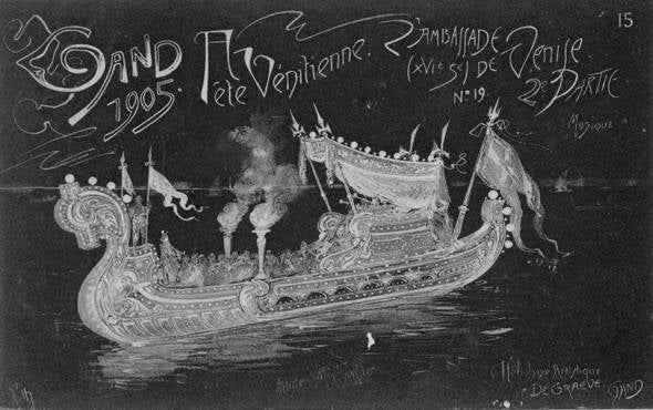 Het succes was bijzonder groot, de pers schreef lovende artikels en men keek reeds uit naar het aangekondigde Venetiaanse Waterfeest dat drie weken later was gepland. Deze festiviteiten werden op voorstel van Gustaaf Carels, toen voorzitter van de Kamer van Koophandel te Gent, ingericht. Het vrij uitvoerige thema luidde : "Gezanten van Venetië brengen een bezoek aan de Stad Gent, omringd van andere Vlaamse steden." De inrichting werd aan de twee belangrijkste Gentse roeiverenigingen, deClub en de SportNautique toevertrouwd. De Club Nautique moest twaalf grote boten versieren tot de uitbeelding van het Gentse gedeelte. De Sport deed hetzelfde maar met veertien boten tot de vertolking van het tweede of Venetiaanse deel. De kunstenaars Jotthier, Claessens enE. De Maertelaere werden voor de voorontwerpen aangezocht. De feestelijkheden begonnen reeds op 2 juli maar de waterstoet ging op 9 juli door. Dagen vooraf waren verschillende wijken schitterend opgesmukt. Het scheelde nochtans geen haar of het zo verbeide feest vielletterlijk in 't water. Tijdens de middag, omstreeks vier uur, terwijl men nog koortsachtig de laatste hand aan de versieringen legde, brak de hel los : een onweer waarbij de regen met kuipen over de stad stroelde, begeleid door donder en bliksem. De organisatoren vreesden het ergste doch gelukkig trok de ellende na een uur voorbij en de hemel werd voor de verdere dag sereen. Om negen uur 's avonds dan voer, opnieuw vanaf de Brugsepoort bij de Coupure, de Venetiaanse lichtstoet af, richting Lindelei, Ajuinlei, Predikherenlei, Kraanlei, Minnemeers, Baudelokaai, door de sluis van de Visserij tot aan de Scheldelaan. Om brandgevaar te vermijden, patrouilleerde de brandweer met twee boten langsheen de stoet terwijl vier reddingsboten van het Rode Kruis tussen beide delen van de stoet voeren. Duizenden veelkleurige vetlampjes verlichtten de zesentwintig versierde boten die als drijvende lichtpaleizen in het water weerkaatsten. Feestelijke illuminatie en toverachtig mooi Bengaals vuurwerk verhoogden het feeërieke uitzicht op kaaien en bruggen. Aan de sluizen van de Visserij werd haltgehouden. Daar werd Venetiaanse muziek en talrijke bekende wijsjes door de meevarende muziekkorpsen, de gemengde zangkoren, de solozangers en -instrumentisten (mandoline- en gitaarspelers) uitgevoerd. Naar een persbericht zag de stoet eruit als volgt. Vooraan het deel, gewijd aan Gent, voer een groot bevlagd en verlicht vaartuig, gevolgd door een versierd schip waarop muziek werd gespeeld. De derde boot beeldde de "Maagd van Gent" uit, zittend op haar troon onder een renaissance-staatsiehemel, omringd door de verzinnebeelde grote Vlaamse steden. Daarna kwamen dan vier kleinere versierde schepen. De achtste in de reeks was een groot vaartuig waarop een versierde Gentse draak, verlicht was voorgesteld. Als nummer negen volgde "Het Keizerrijk", een weelderig opgesmukt schip waarop de Koninklijke en Keizerlijke Staten van Karel V in wapenschilden, spreuken e.d. symbolisch werden uitgebeeld. Voer daarna een boot aan waarop een enorme dolfijn te zien was, gevolgd door een vaartuig waarop de Schelde en de Leie als stroom en rivier zinnebeeldig voorgesteld werden. Doorschijnende schilderijen, feeëriek verlicht, smukten de boot aan weerszijden op terwijl een waternimf op de· achterplecht de aandacht trok. Vier Venetiaanse gondels openden het tweede gedeelte : de schitterende optocht van de doge van Venetië en de beroemde "Bucentaur". De zeventiende boot was vooraan versierd met de Leeuw van Sint-Marcus en achteraan met Sint-Joris die de draak doodt, beide zinnebeelden van de Venetiaanse Republiek. Een muzikaal gedeelte kwam daarop volgend. Op een groot vaartuig was middenin een sterk verlicht zomerhuisje opgetimmerd waarin een muziekkorps oude aria's vertolkte. Een groep zangers, op het negentiende schip opgesteld onder een schitterend geïllumineerd baldakijn, zong Italiaanse liederen uit de 16de eeuw. De vaartuigen 20 en 21 beeldden Venetiaanse barken met gehesen zeilen uit terwijl de achterna komende drie als typische scheepjes uit diezelfde streek versierd waren. Tenslotte voer de "Bucentaur", door een sleepboot getrokken, voorbij de enthousiast toejuichende menigte. Het vaartuig was een getrouwe kopie van de beroemde galei van de doge van Venetië, de meester van de Adriatische Zee. Deze voer jaarlijks, op Hemelvaartdag uit om de stad aan de zee uit te huwelijken. Tot op het eind van de achttiende eeuw ging deze traditionele plechtigheid door, die daaruit bestond, dat de doge een gouden ring wierp in de Adriatische Zee. Het eindpunt van deze Venetiaanse waterstoet lag aan de Scheldelaan. Kanongeschut en vuurwerk kondigde de aankomst van de botensliert aan en daarenboven stak men af en toe Bengaals vuur aan. Een muziekkorps begroette het binnenvaren van elk schip afzonderlijk. Toen het laatst versierde vaartuig eindelijk arriveerde, ontbrandde onmiddellijk een grandioos vuurwerk op het water. De festiviteiten gingen door tot in de vroege ochtenduurtjes ...