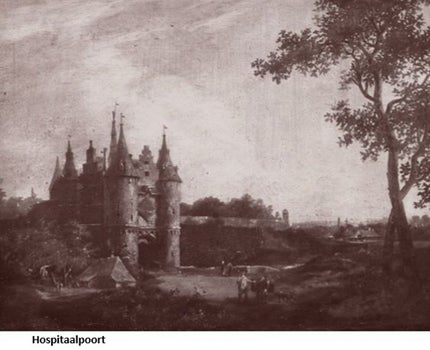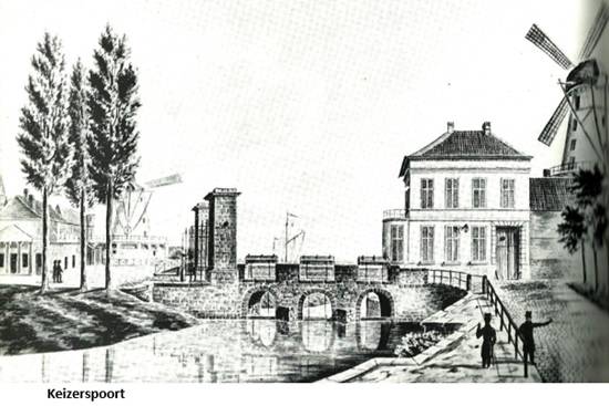 Een zuidoostelijke poort. Dit is nu het kruispunt van de stadsring die hier Keizersvest wordt genoemd en de Sint-Lievenspoortstraat.