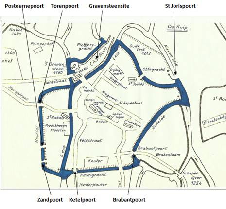 In de 12de en 13de eeuw was het historisch centrum van Gent omsloten door een eerste verdedigingsgordel van natuurlijke en gegraven waterlopen. De Schelde en de Leie werden verder aangevuld met de gegraven Ottogracht, de Houtlei en de Ketelvest. De hele omwalling werd door 6 stadspoorten versterkt.