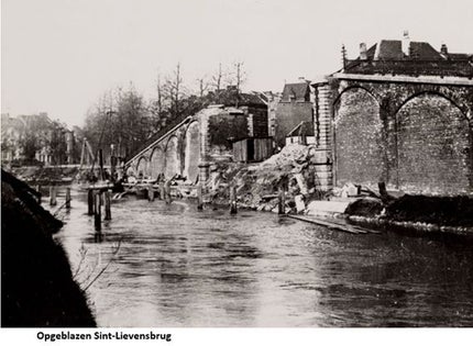 de brug begin Brusselsesteenweg. Rechts tussen de twee bruggen bevond zich vroeger de grote katoenfabriek van de N.M.D. Vanderhaeghen, die afbrandde in 1926. De fabriek werd niet herbouwd. Na het sluiten van het Zuidstation in 1928 en de aanleg van de autoweg naast de Frère Orbanlaan, thans Zuidstationlaan genaamd, werd de eerste Sint-Lievensbrug afgebroken en herbouwd in de verlenging vande nieuwe weg. De tweede brug op het grondgebied Ledeberg ligt er nog en geeft toegang tot de Pynaertkaai.