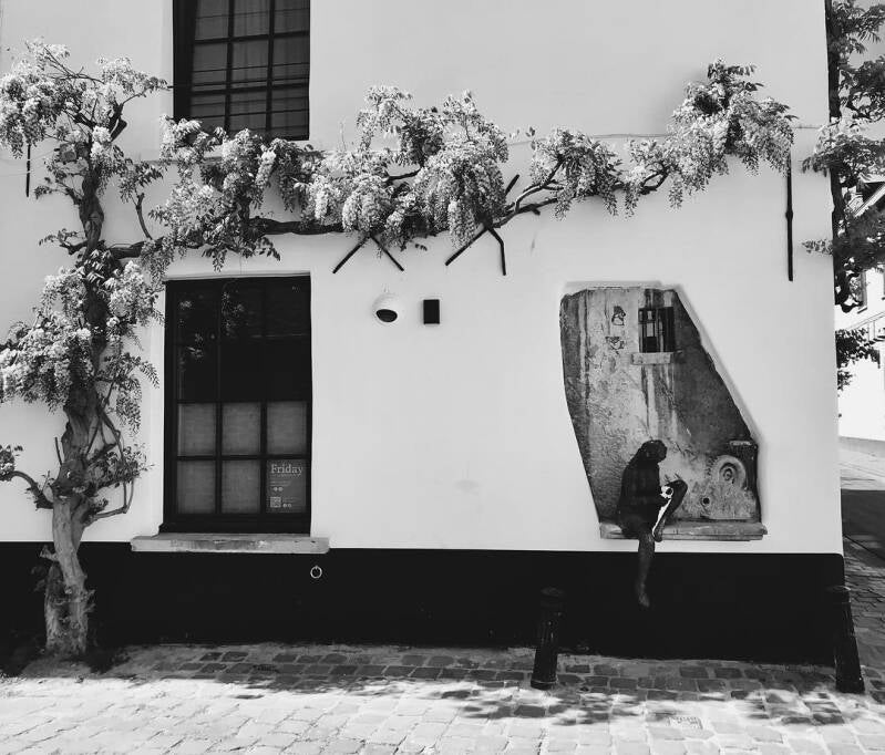 Op de hoek van de Zilverhof en het Pluimstraatje is een venster ingenomen door een beeldhouwwerk: voor een achtergrond van een twee meter hoog blok blauwe hardsteen zit een bronzen beeld van een breistertje stevig vastgeankerd.