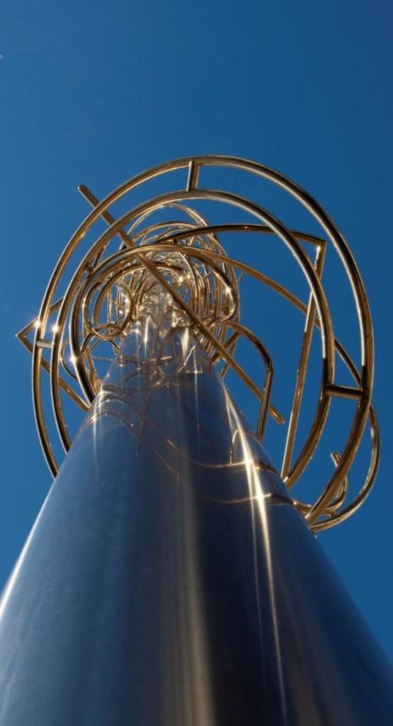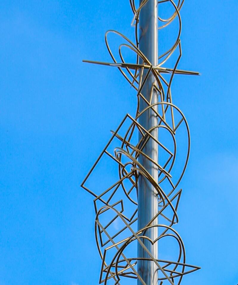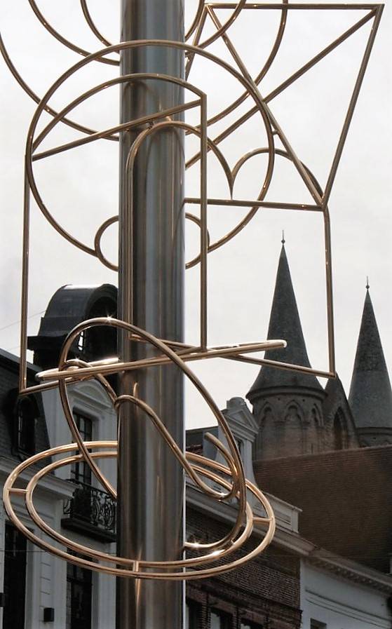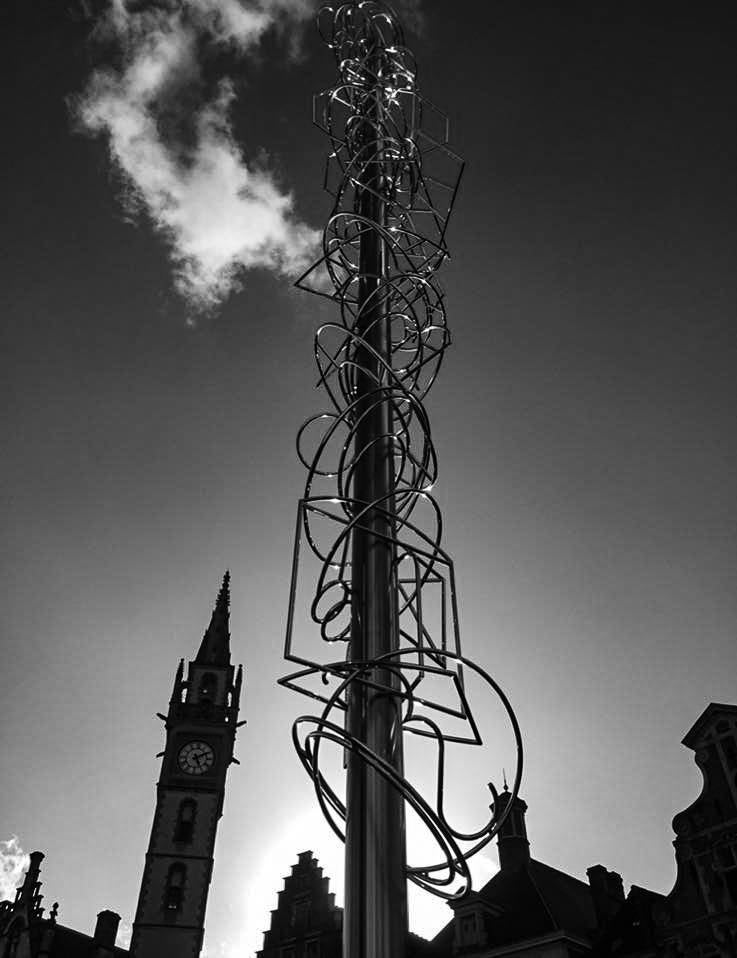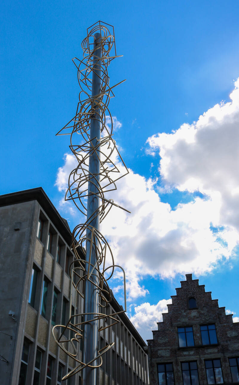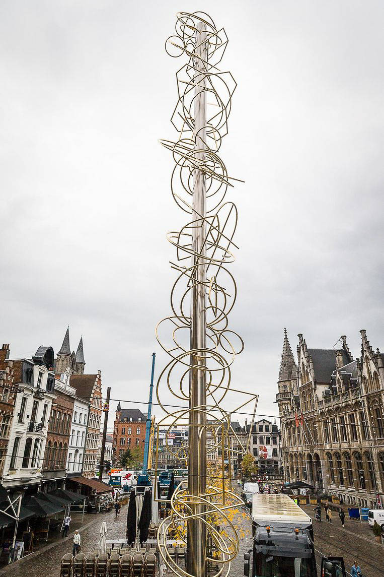 Het kunstwerk van Ayşe Erkmen oogt als een glinsterende gouden ketting van 20 meter hoog kaarsrecht de lucht in. Elegant. Speels. Fonkelend. De schakels in de ketting hebben de vorm van de ramen van de middeleeuwse gebouwen in het hart van Gent. Ze zijn gemaakt in messing, een glanzend goudkleurig metaal.