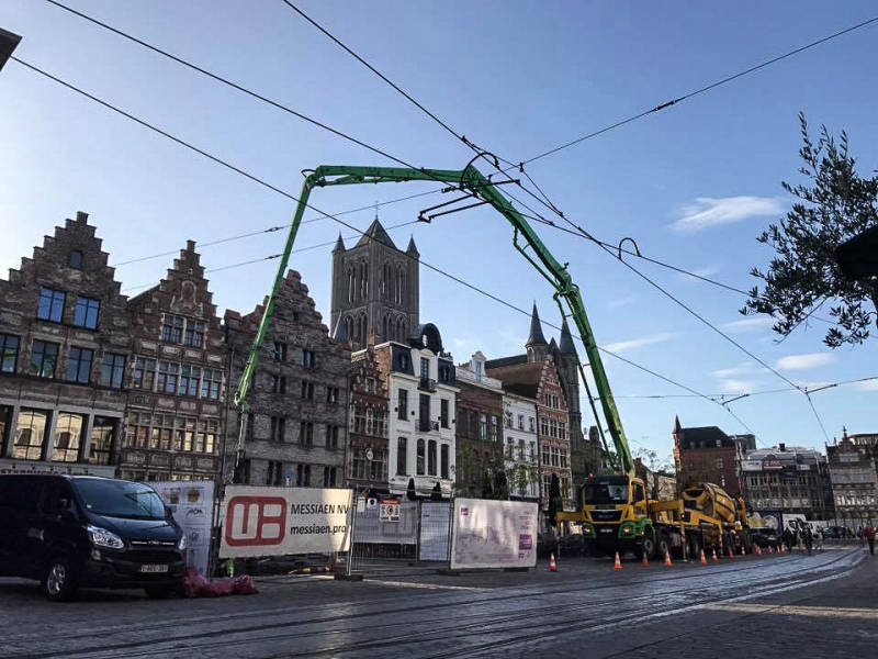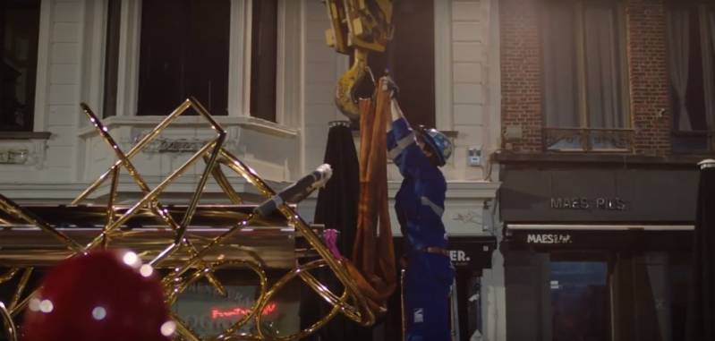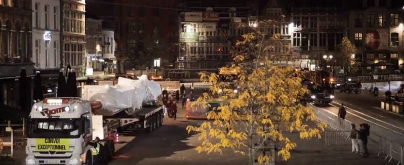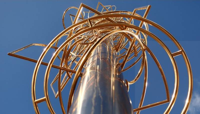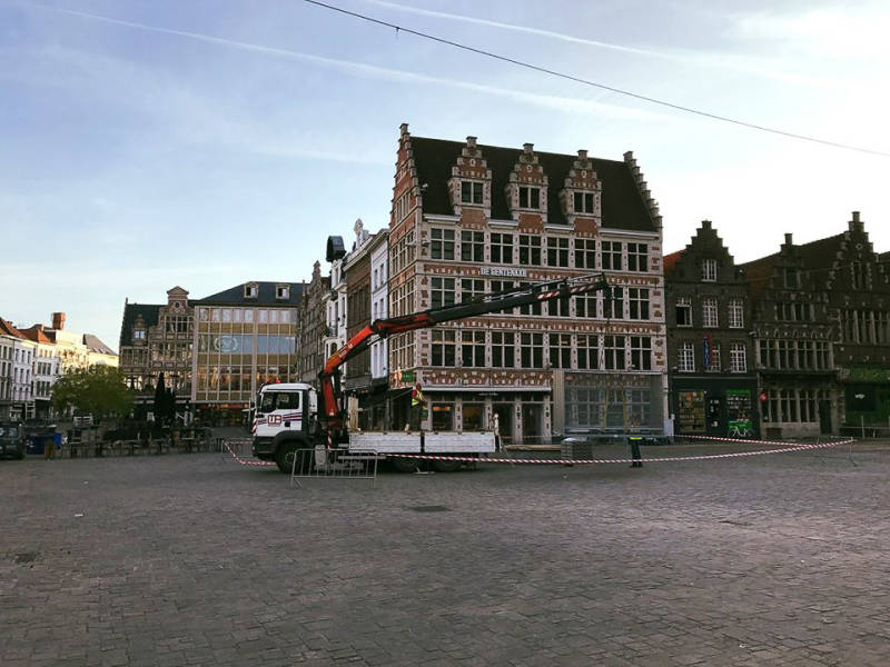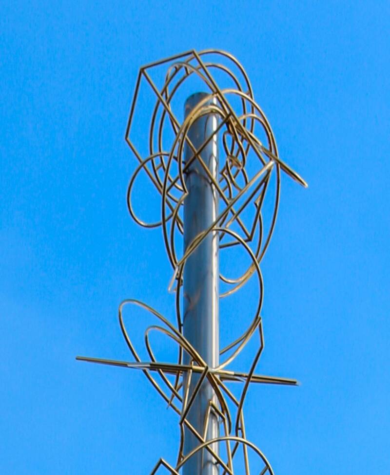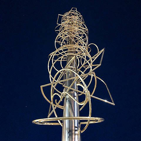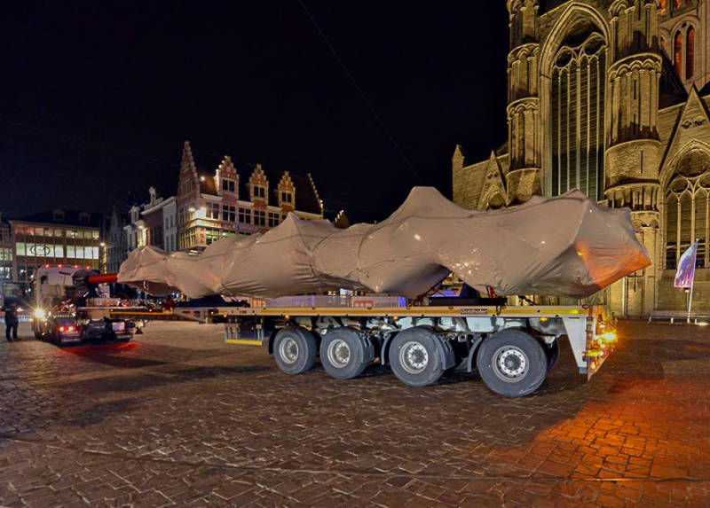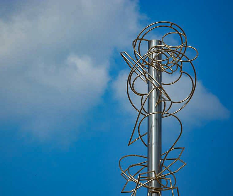 Het kunstwerk van Ayşe Erkmen oogt als een glinsterende gouden ketting van 20 meter hoog kaarsrecht de lucht in. Elegant. Speels. Fonkelend. De schakels in de ketting hebben de vorm van de ramen van de middeleeuwse gebouwen in het hart van Gent. Ze zijn gemaakt in messing, een glanzend goudkleurig metaal.