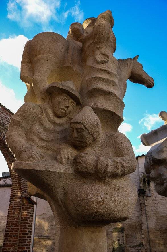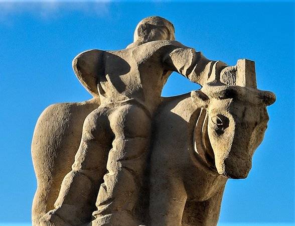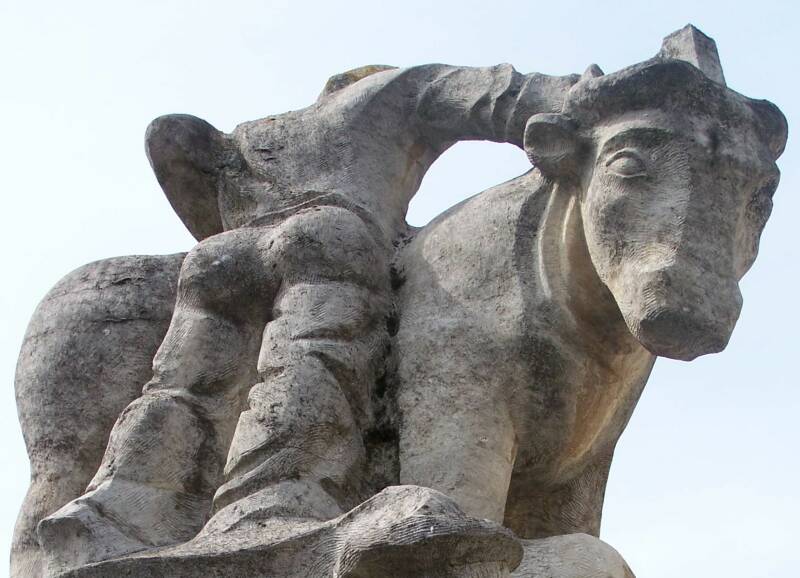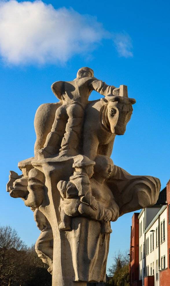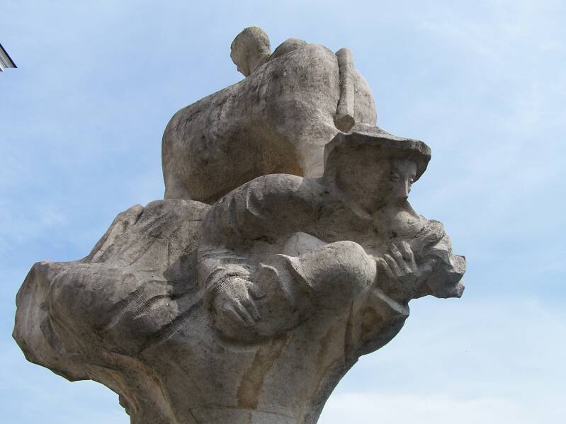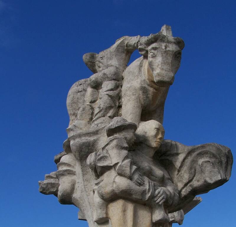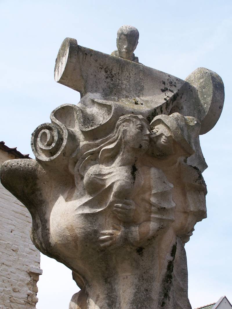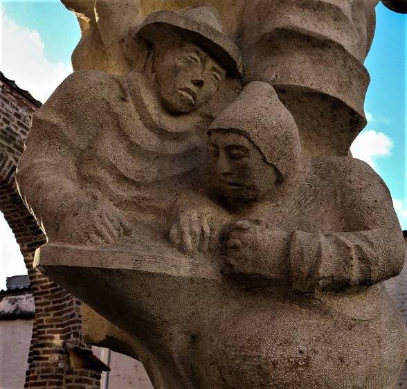 Keizer Karel & Mooie Veerle vinden we hartstochtelijk kussend onder een koe terug (haar vader was immers een slachter). Hun zoontje, die van de moeder wordt weggenomen, wordt aan de andere zijde uitgebeeld.